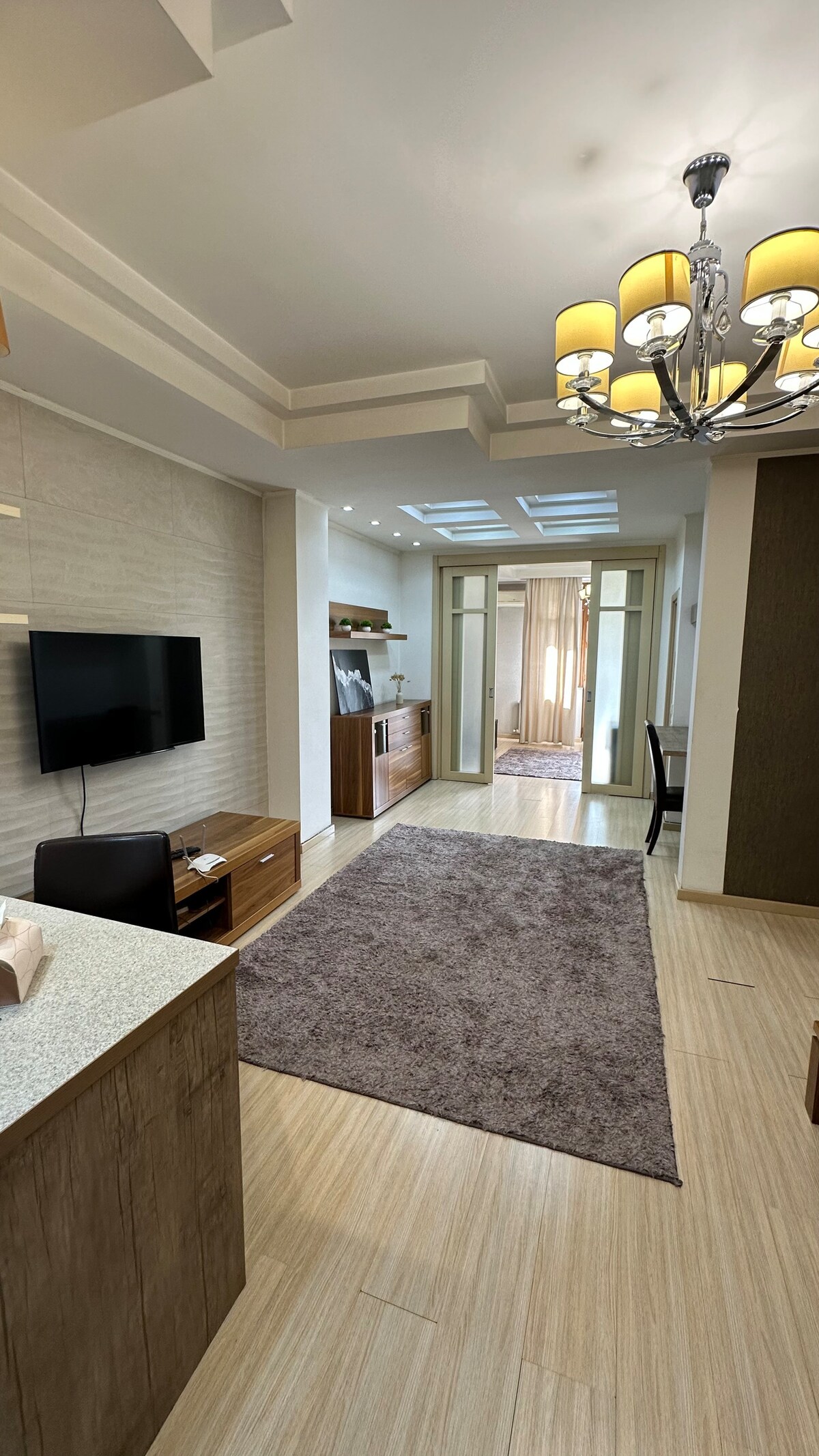 Bright and cozy modern apartment in the center of Bishkek, located in a quiet green courtyard. Fresh renovation, natural wooden floors, new furniture, and modern appliances create a warm home like atmosphere. One bedroom with a walk in wardrobe, living area, and fully equipped kitchen. Orthopedic mattress, fast Wi Fi, cable TV, air conditioning, and a comfortable workspace. Open balcony facing a green yard and a loggia on the opposite side. Self check in via secure lockbox. Ideal for your stay.