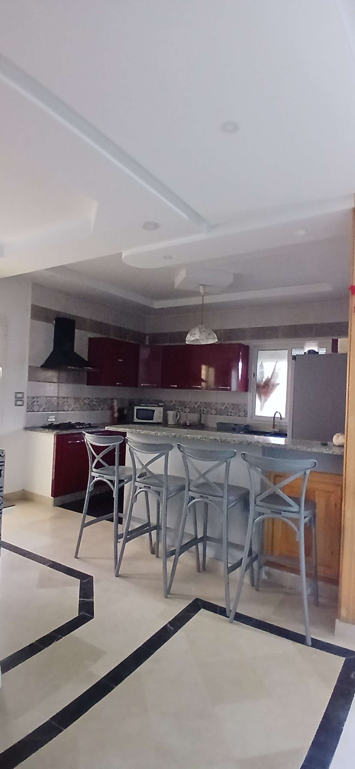 Découvrez l'étage supérieur de cette villa de haut standing à quelques kilomètres de Bizerte. En face de la celebre forêt d'errimel et 400me à traverser pour accéder à une des plus belles plages de sable fin de Tunisie Grande salle de séjour avec cheminée et Terasse panoramique sur la mer. 1 suite parentale avec salon et terrasse, 2 chambres avec sd wc. Vaste cuisine entièrement équipée . Jardin de 1500 mc et un studio de style provençal Parfaite pour les voyageurs en quête de tranquillité.