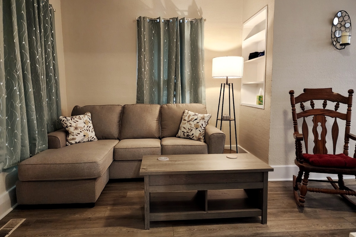 Disfruta de una experiencia de lujo en este céntrico alojamiento. Nuestra dulce casa de campo se encuentra en el corazón del centro de la ciudad, donde el Centro Cívico, restaurantes y cafeterías locales, boutiques únicas, todo a poca distancia a pie. Hay un montón de cosas que hacer y muchas otras atracciones para disfrutar. El espacio ofrece 2 dormitorios (uno king, una cama doble), 1 baño es cómodo para 1-4 personas. Esta casa está totalmente amueblada con todo lo esencial que necesitarás. No apta para niños pequeños.