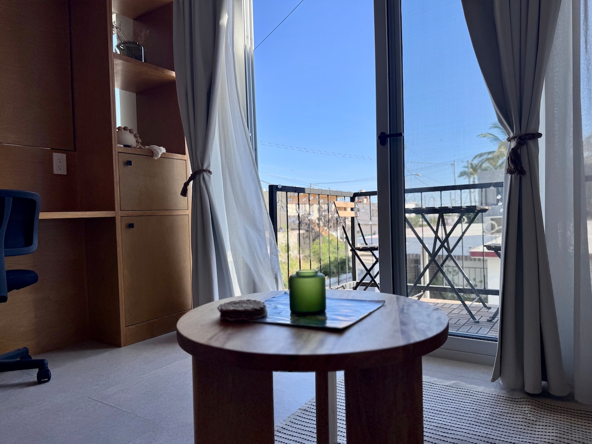 Encaramada en la montaña, la casa de la colina con cama tamaño king tiene tres grandes ventanales y una terraza con vistas al valle del desierto y al Parque Nacional Marino. La casa está situada al final de una carretera que se suma al carácter tranquilo y silencioso de Cabo Pulmo, pero está lo suficientemente cerca y a 10 minutos a pie de tiendas de buceo, restaurantes y rutas de senderismo. Este alojamiento tiene Starlink. La casa no está preparada para fiestas, música ruidos y niños menores de 12 años. Hay aparcamiento en el sitio.