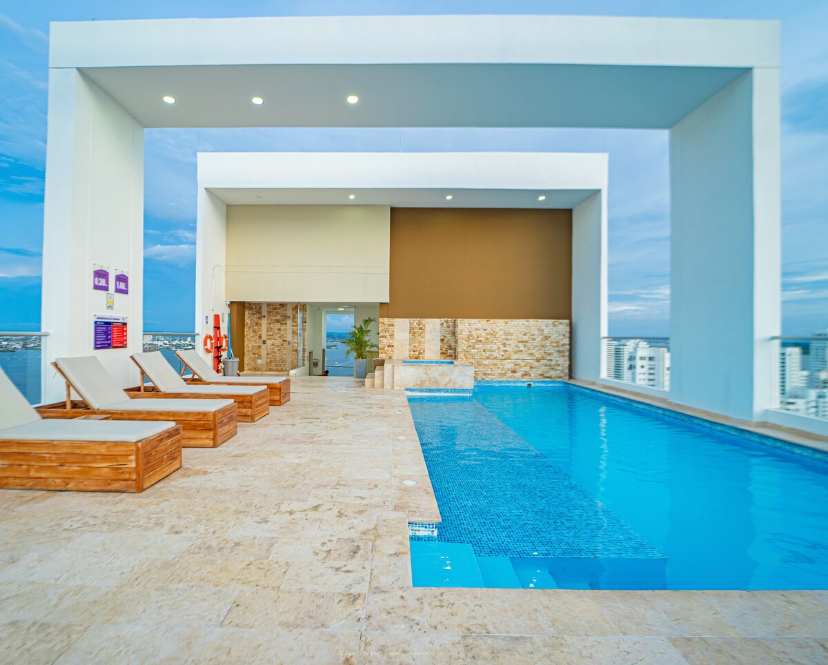 Lujoso y espectacular apartamento con Vista Frente al mar, a la ciudad y a la bahía. Ideal para grupo familiar y grupo corporativo. Podrás disfrutar de la playa, bellos encuentros en el amplio balcón y las piscinas. Cuenta con todo lo necesario para una estancia inolvidable. A tan solo 5 min del centro historico de la ciudad, con muchas opciones de transporte. La hermosa vista desde el balcón es todo lo que necesitas, quedarás muy feliz y tendrás la mejor de las experiencias!!