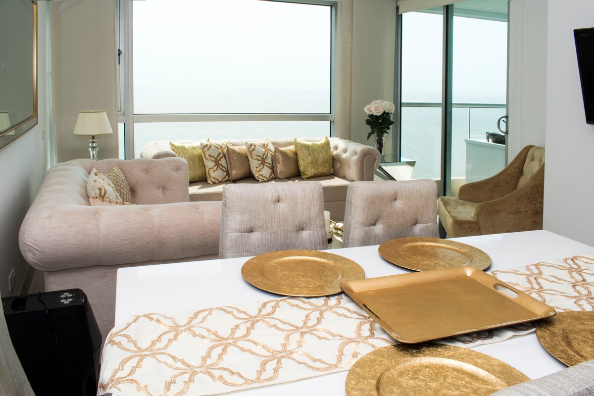 Nuestro elegante apartamento está ubicado en uno de los más completos y modernos edificios del exclusivo sector "Cielo Mar", a pocos metros de una de las mejores playas de la ciudad "Playa azul", a 10 minutos del Centro Histórico y a 5 minutos del aeropuerto. El apartamento tiene una vista Extraordinaria de la Bahía y el Océano que puedes disfrutar desde el Jacuzzi privado en el balcón o en las increíbles Piscinas infinitas en el Rooftop que cuenta Jacuzzis, Sauna, Terraza Bar & BBQ