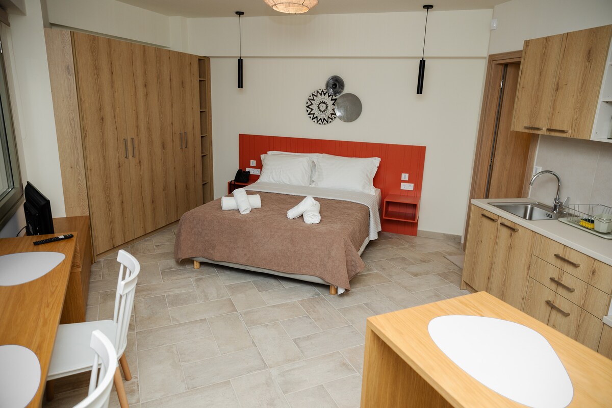 The M4 Standard Suite on the second floor offers 28 sq.m. of comfort and practicality, ideal for couples or solo travelers. It features a large double bed, private entrance, full air‑conditioning and soundproofing. The terrace provides a pleasant view, while the bathroom includes a shower and essential amenities. Additional features include free Wi‑Fi, a 43” Smart TV, fridge, coffee machine, kettle, wardrobe and tea/coffee facilities. The apartment is accessible by elevator.