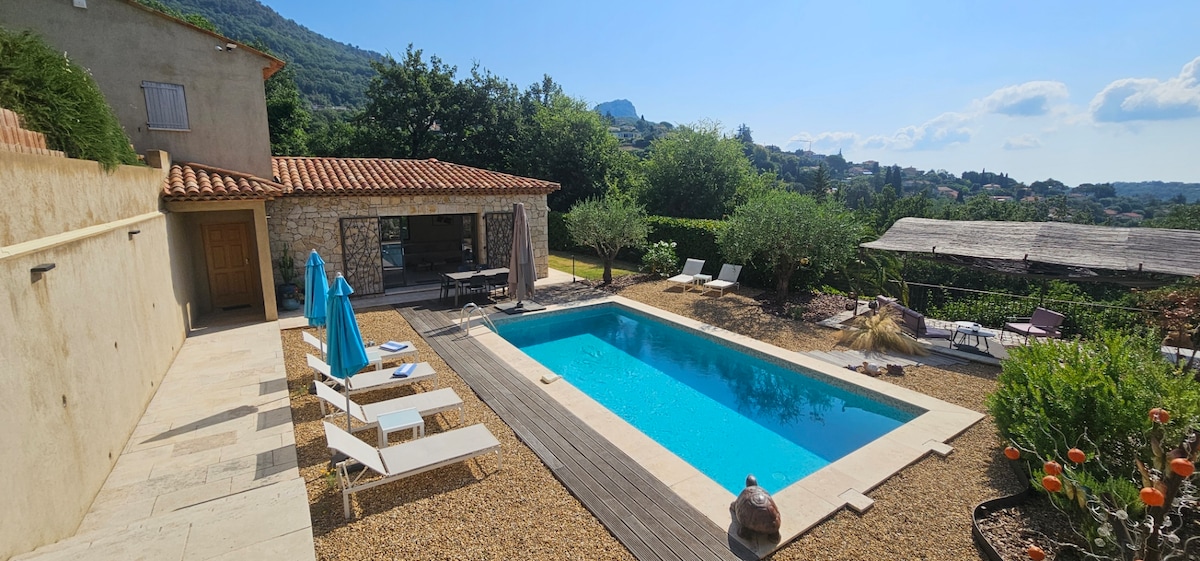 Rare find! Spacious villa with king size swimming pool, located on a hill with beautiful view of the sea in a quiet residential area with a bakery at the beginning of the street. 15 minutes drive from Nice Airport, Nice old town, artist villages Vence and St. Paul de Vence, modern Shopping Promenade Riviera and large supermarkets. The villa has 3 bedrooms, 2 bathrooms, kitchen, living room, garden, large terrace and a balcony with terrific view. Available per 7 days, from Saturdays to Saturdays.