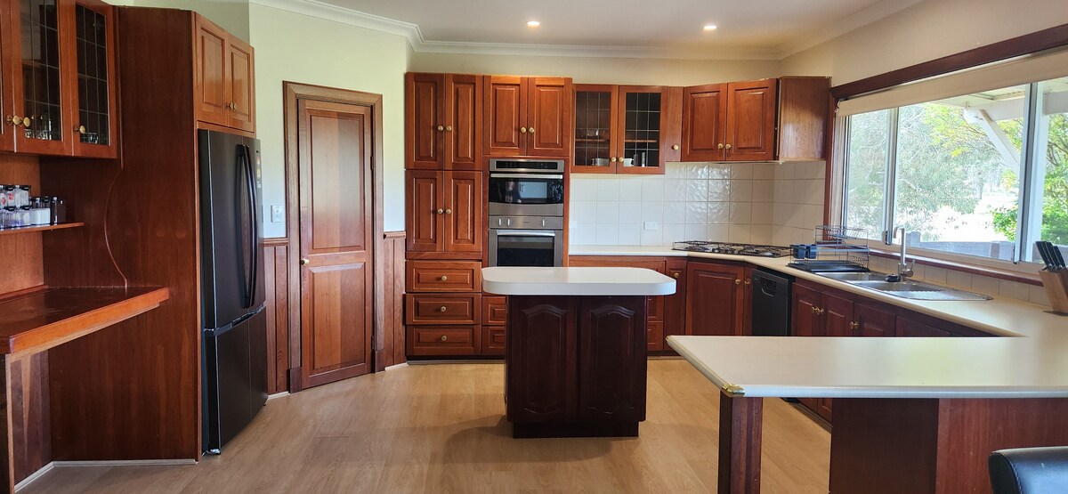 Relájate y disfruta de la paz y la tranquilidad en la hermosa casa de campo de nuestra propiedad de 13 acres, donde los canguros vagan libremente y ocasionalmente puedes ver un equidna. Los patos salvajes y las tortugas de cuello largo viven en nuestra presa, que durante los meses de invierno se desborda y cae en cascada por la colina hasta convertirse en una estruendosa cascada que se puede escuchar desde la casa. Hay una gran cantidad de aves: cucaburras, gálatas, urracas, loros, reyezuelos azules, por nombrar solo algunos. Nuestra propiedad NO es apta para niños ni bebés.