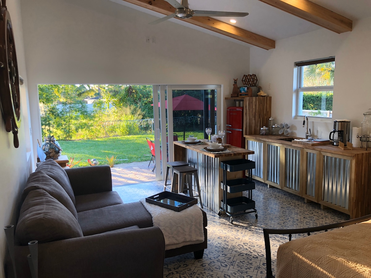 Hermoso estudio espacioso de nueva construcción en el centro de Bonita Springs, a 7 millas de la mundialmente famosa playa Barefoot y a solo 100 pasos del popular parque Riverside, donde se celebran muchos eventos y festivales. Este espacioso estudio es moderno, con un techo muy alto con vigas de madera a la vista, bien iluminado con puertas correderas gigantes, con una cocina de tamaño completo y una zona de patio completa. Perfecto para una pareja en una escapada o incluso para una sola persona que viaja por placer o trabajo. Limpio en todo momento.