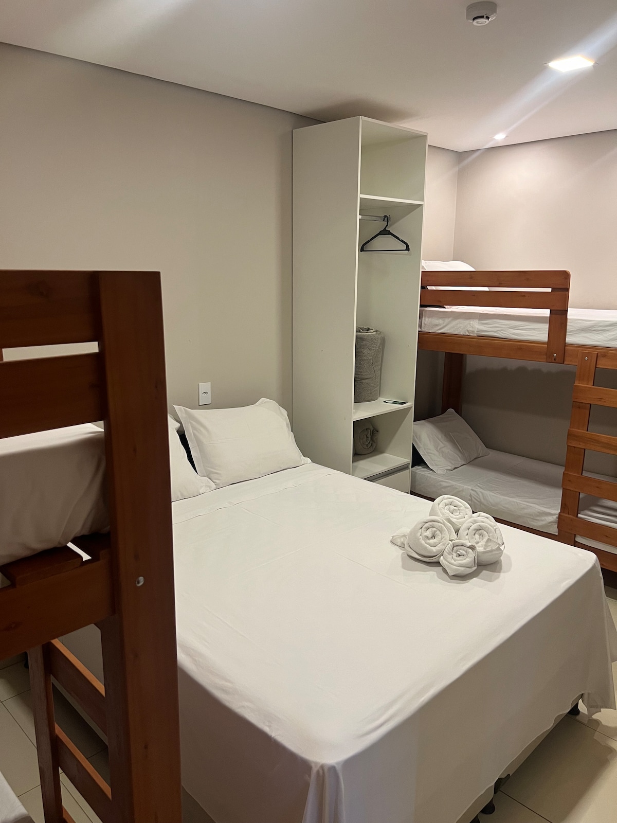 Perfecto para familias, habitación espaciosa, con 1 cama doble grande + 2 literas. Totalizando 6 plazas en camas. Habitación con baño privado, aire acondicionado, minibar, muebles a medida, ropa de cama y toallas, limpieza diaria y por la mañana un delicioso desayuno ya incluido en la tarifa diaria. Contamos con piscina, parrilla, cocina compartida, hamacas, wifi, estacionamiento, entre otros.