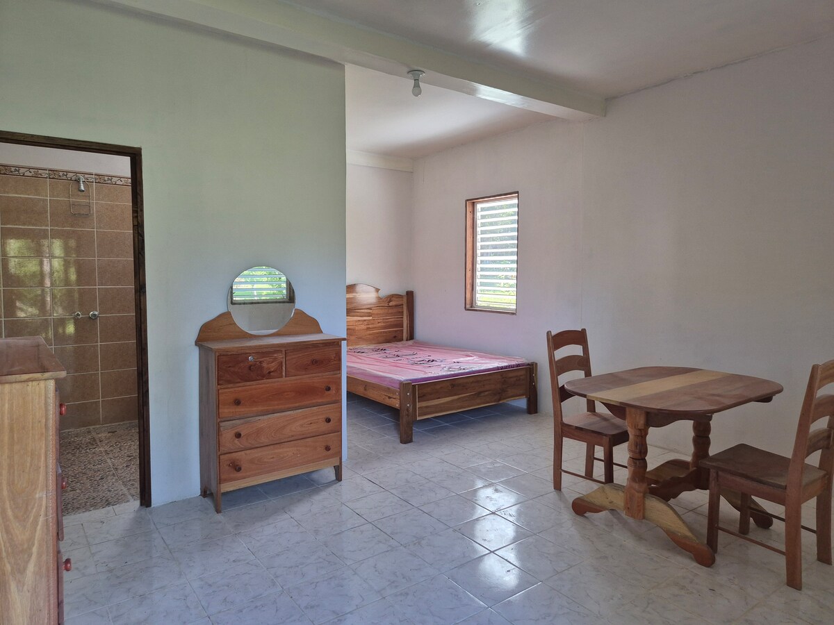 We offer a Cottage with 2 bedrooms. Our guests can experience an authentic, Partially off-grid living experience in the tropical jungle. We designed a thatched roof cabana built with natural materials straight out of the jungle. Get close to nature and explore our garden and surrounding farm. The 4-acre property includes an outdoor fresh rainwater catchment system. Our neighbors, also farmers, are living as simply as possible, happily growing their own food, raising families and staying healthy.