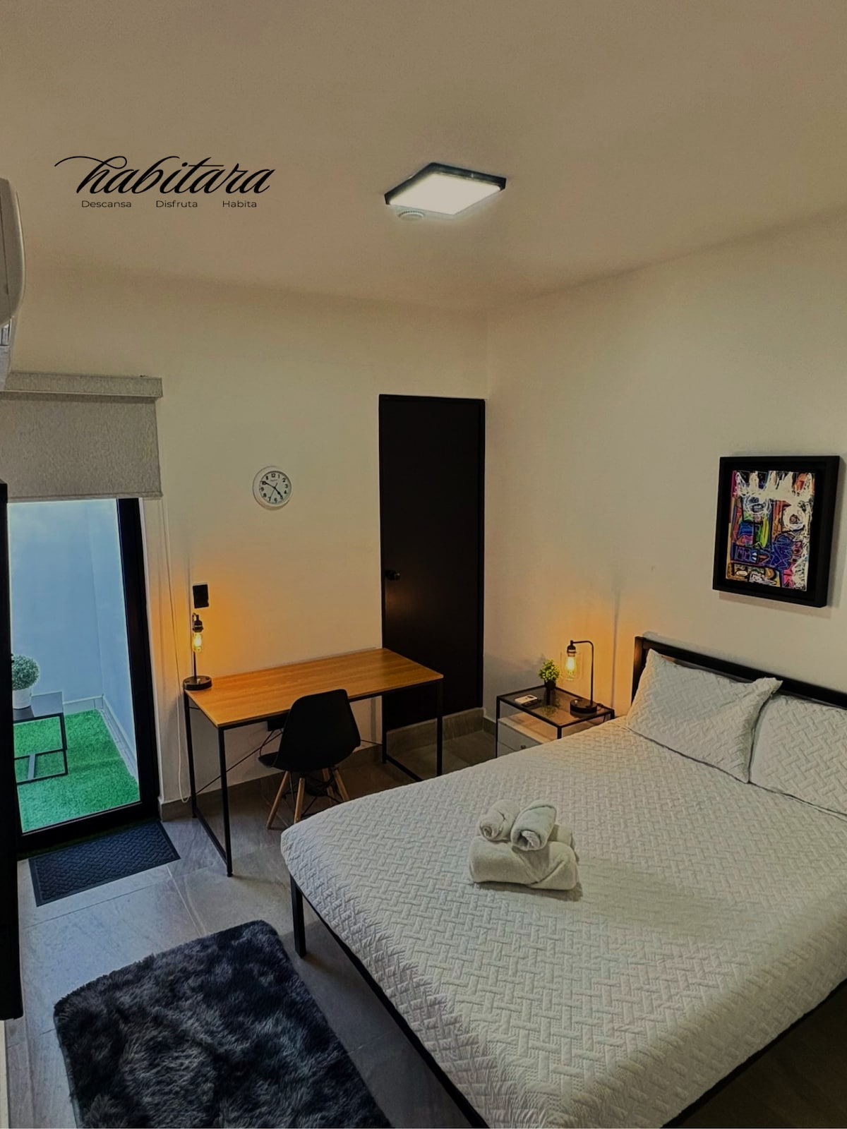 Nuestro Loft cuenta con todo para disfrutar de un descanso reparador: A/A minisplit inverter que te mantendrá fresco durante todo el día, agua caliente y un baño moderno y equipado. Disfruta de tus series favoritas en la Smart TV con servicios de Netflix, Prime y programación local. El garaje te brinda la comodidad de guardar tu auto y la cocineta equipada te permitirá preparar tus alimentos como en casa, si viajas con tu mascota disfrutará de un pequeño jardín donde tambíen se podrá relajar!