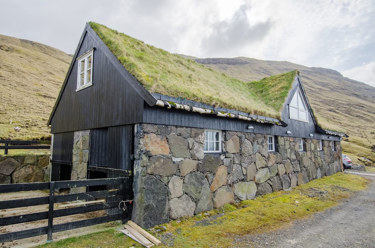 Una casa de piedra y madera con tejado de césped situada en una ladera. Un lugar muy tranquilo con ovejas, pájaros y hierba verde hasta donde alcanza la vista. Justo enfrente de la casa está el océano Atlántico Norte. No hay vecinos. Ideal para alguien que busca un alojamiento tranquilo y silencioso. La casa fue construida en 2010 con un antiguo estilo tradicional feroés. Cuenta con 1 dormitorio, un aseo, cocina y sala de estar, todo con una vista fantástica.