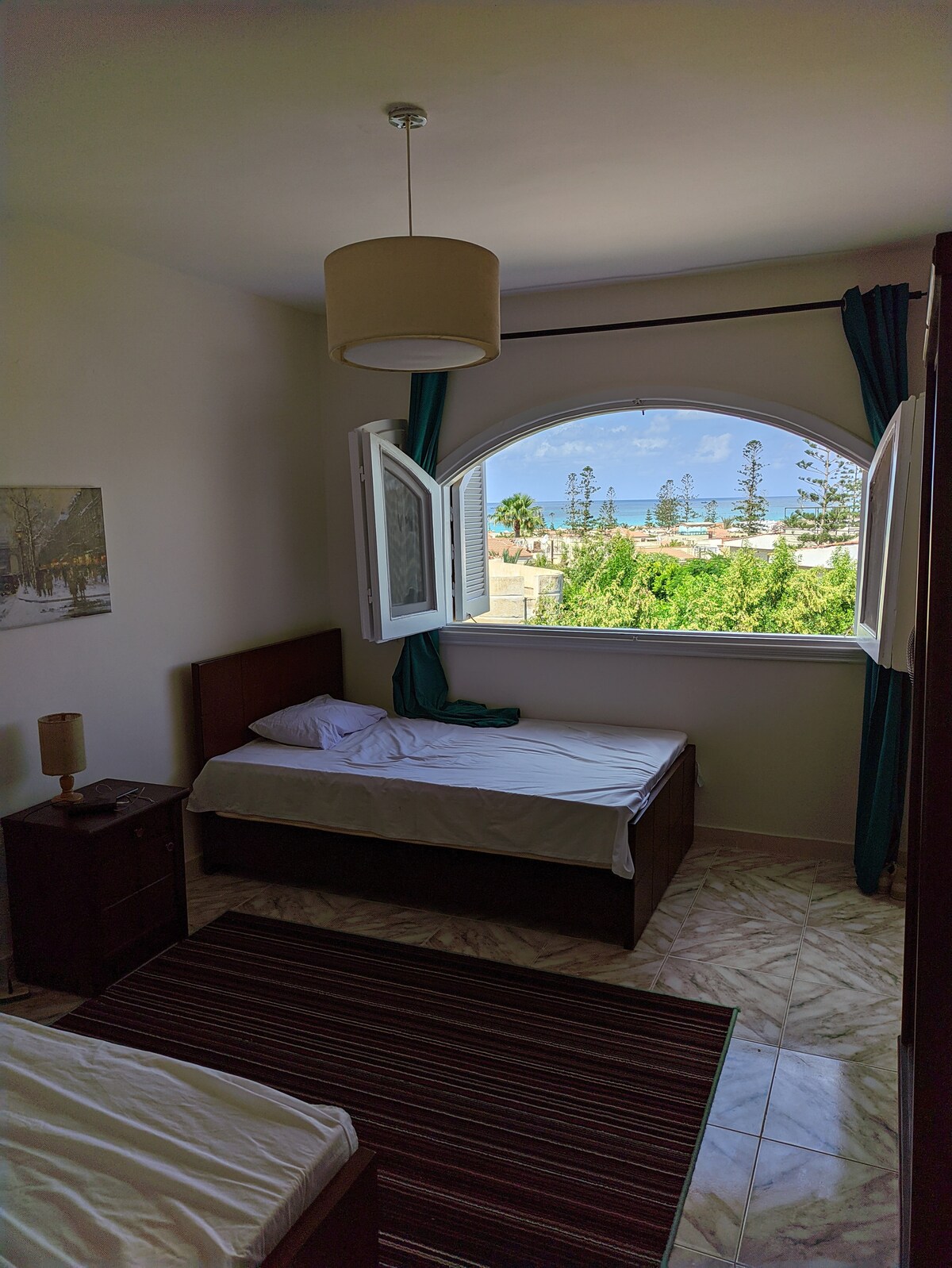 Este es mi propio lugar de escapada en el mar Mediterráneo, en la costa norte de Egipto. Así que cada rincón está atendido con pequeños detalles para que tu estancia sea cómoda. También he creado todo el arte en la pared específicamente para este lugar. Puedes disfrutar de la brisa desde cualquiera de las dos terrazas con vistas a la gran piscina compartida, o subir a la azotea para ver la puesta de sol y tomar una copa de vino y darte un chapuzón en tu propia piscina privada mientras contemplas el magnífico mar Mediterráneo.