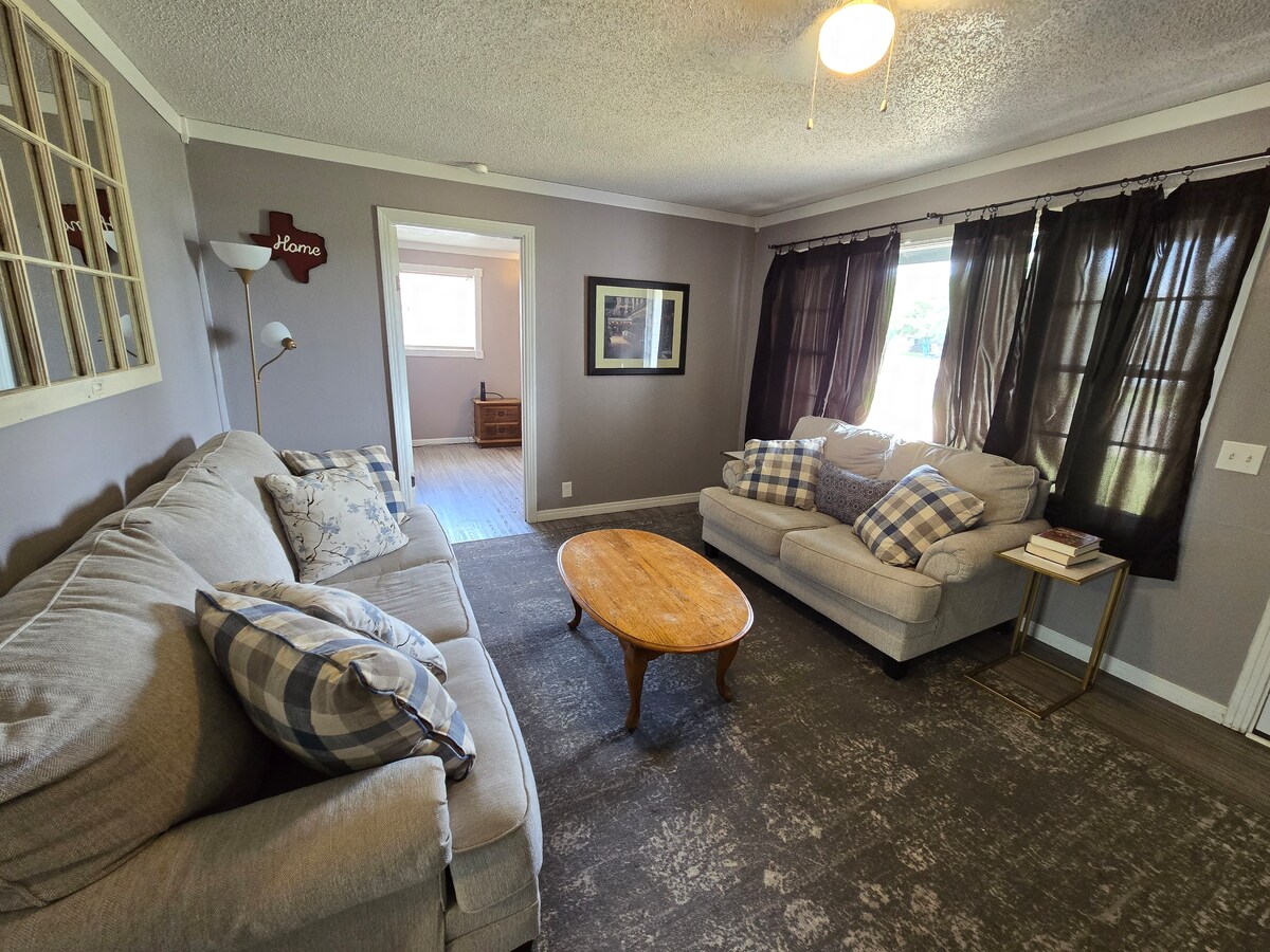 This cozy 2 bedroom/1 bath fully furnished whole house Airbnb is perfect for the traveler coming to or through the Texas Panhandle. Basic Amenities: Facilities: Kitchen/Dining: Dining table with 4 chairs, a fully equipped kitchen for all your basic needs. Bath: 1 bathroom, soap, shampoo and towels provided. Bedrooms: 1 Queen bed, 1 Full bed and 1 Full Sofa Sleeper. USB Ports bedside. Utility room at your service. Wifi included. Serveillance system monitors the property (outside only).