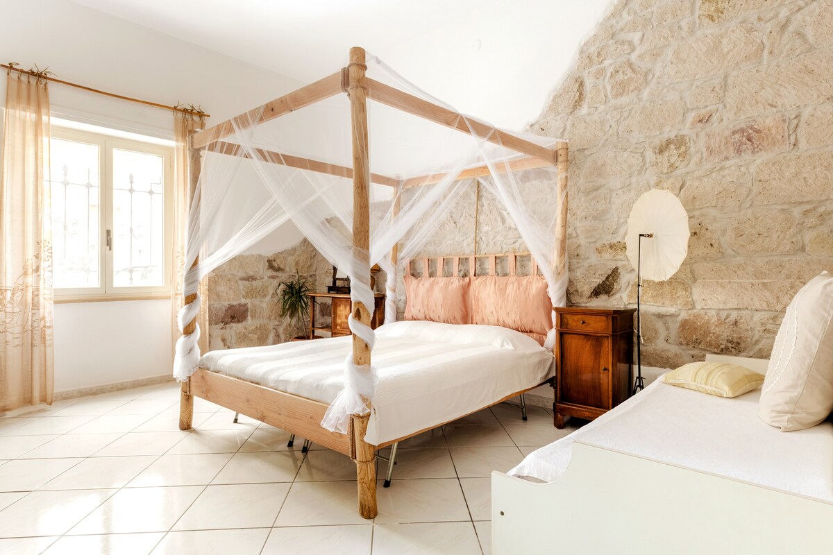 La casita en Via Pia es una pequeña casa histórica de 1880, típicamente construida con piedra local: el basalto negro de la meseta de Abbasanta. "Casetta", porque todo parece en pequeño formato... las pequeñas ventanas, el horno de pan, el patio. Un nido de amor cómodo y acogedor, adecuado para aquellos que quieren vivir experiencias sensoriales (¡especialmente gastronómicas!) en esta parte menos conocida de Cerdeña, que alterna mar, llanura, colina y montaña y una tradición viva y auténtica