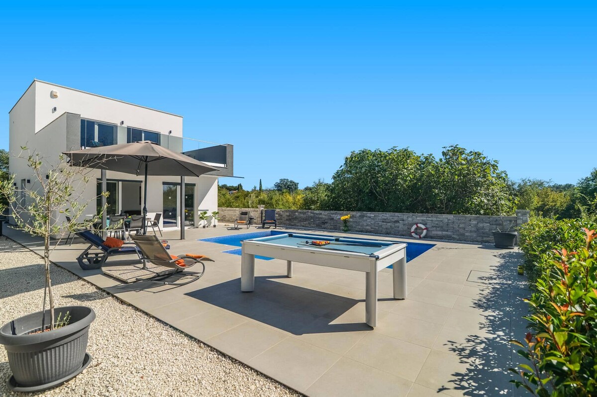 Stylish villa near Rovinj with picture worthy pool, sunk in hot tub, sauna. Wake up to lush, panoramic valley views. Couples and family-friendly, a short drive to adventure park, Brijuni National Park, dinopark, medieval towns & local cuisine. It is a true green escape for anyone looking to get back to nature with all the comfort of modern living. Fully equipped for cooking and entertainment in 2600 m2 of garden (football, speed ball, badminton & pool fun) for your kids and loved ones to enjoy.