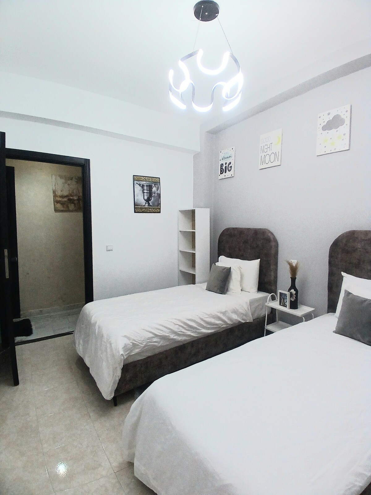 Welcome to our charming 3-bedroom apartment nestled in the vibrant heart of Tangier's hyper center. All necessary amenities are available: Air-conditioning, Smart Tv, Netflix, fiber-optic internet connection, coffee machine, towels, shower amenities, etc Located on the last floor of the building with elevator access, you are just a few stairs away to access the incredible rooftop and admire breathtaking views of Tangier, Spain, the straits of Gibraltar and the mountains of Chefchaouen.
