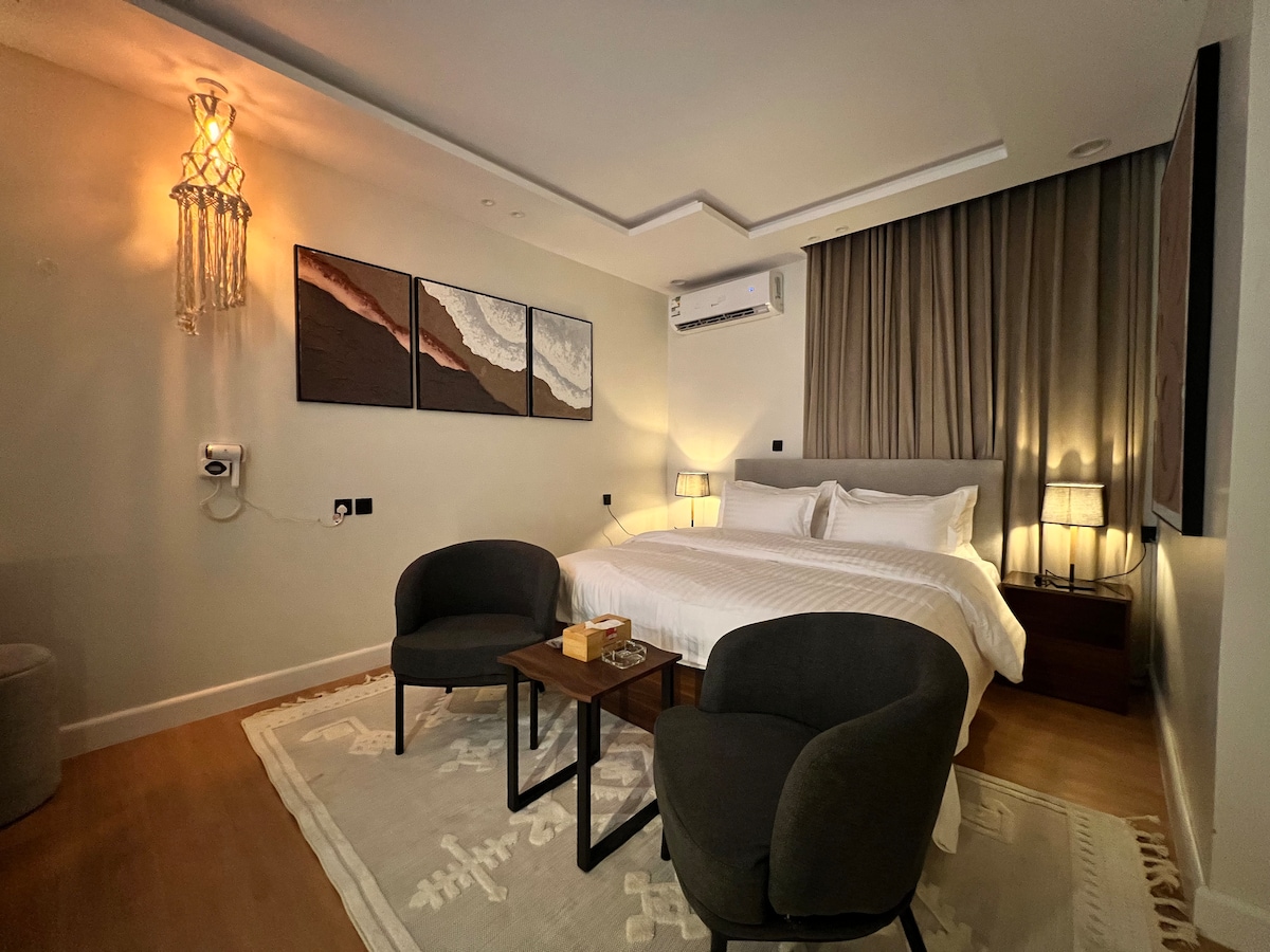 Un apartamento tipo estudio de lujo en el corazón de Riad, perfecto para viajeros exigentes que buscan comodidad y estilo. Disfruta de atracciones cercanas, restaurantes elegantes y centros comerciales. Cerca de : - Boulevard City (a 4 minutos). - Boulevard World (6 min) - Aeropuerto (a 25 minutos). - Wonder Garden (12 min) - KAFD (10 min) - AlBujairi (13 min)