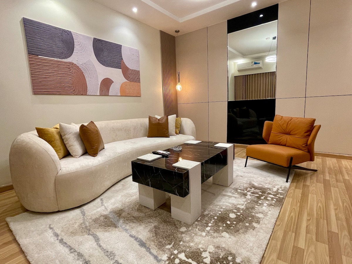 Un apartamento moderno diseñado para una estancia excepcional, situado en uno de los mejores barrios de Riad con unas vistas impresionantes de KAFD. Cuenta con una zona de estar al aire libre con pantalla y proyector para disfrutar de las noches. Para tu comodidad, la cama incluye una capa adicional de 14 cm de alta calidad. «También ofrecemos servicios de coordinación de eventos para ocasiones especiales (incluyendo pasteles y accesorios) por una tarifa adicional con reserva previa, lo que garantiza una experiencia inolvidable»