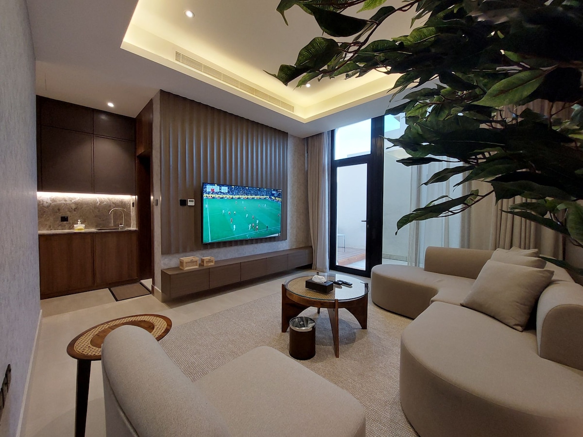 Disfruta de una gran experiencia en este alojamiento completo en el barrio de Hateen, a un minuto del Boulevard. Un apartamento que consta de un dormitorio con una cama tamaño king con un colchón cuidadosamente seleccionado para un sueño completo, una amplia sala de estar y un baño completo. Hay una gran pantalla inteligente de 70 pulgadas e internet de alta velocidad disponibles junto al Boulevard y el parque infantil Kingdom Arena a 5 minutos. Todos los servicios de restaurantes, lavanderías y tiendas de comestibles están disponibles cerca de la residencia. También hay servicio de limpieza disponible