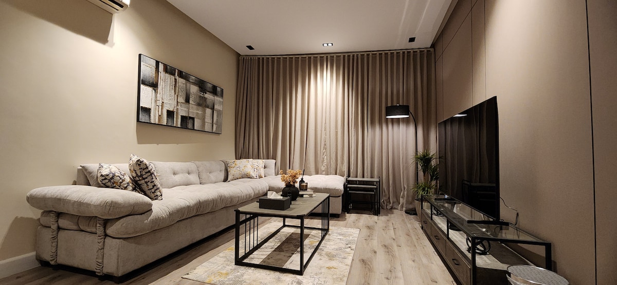 La decoración de este apartamento es moderna, cuidada y diseñada con gran cariño y dedicación. Hemos intentado crear un espacio con todas las comodidades posibles, para que nuestros huéspedes se sientan como en casa con serenidad mental y felicidad. El apartamento está cerca de los lugares y eventos más atractivos de la ciudad de Riad. (KAFD, Kingdom Arena, Boulevard Word, Boulevard City, Parque de Riad, Winter Wonderland).