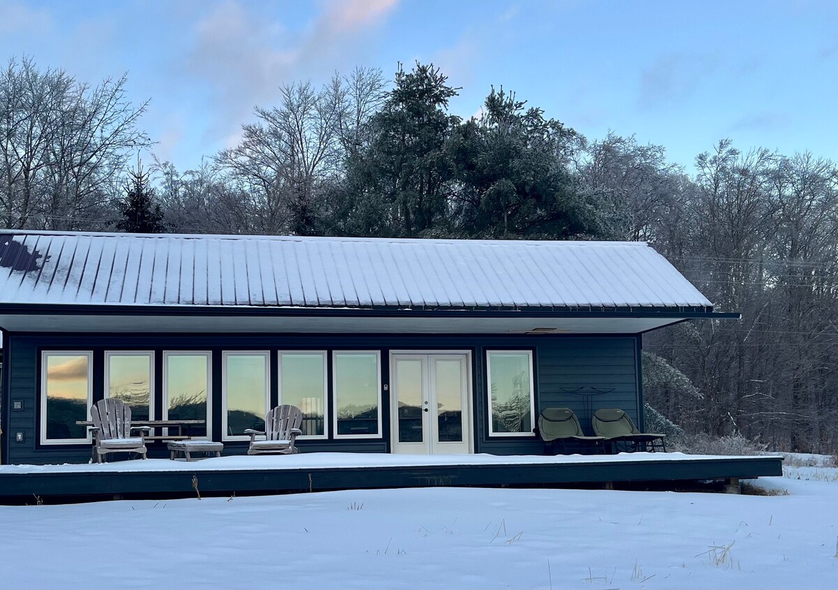 Escápate al bosque y duerme bajo las estrellas en esta pequeña cabaña fuera de la red, perfecta para una escapada de verano tranquila. Ubicado en 4 acres privados y rodeado de más de 150 acres de tierra pública estatal, es un sueño para los amantes de la naturaleza. El departamento tiene una cama de tamaño completo, con una acogedora zona de estar y comedor que ofrece vistas al bosque. La cocina pequeña incluye un fregadero, una estufa de un quemador y artículos básicos de cocina. En los meses más fríos, una estufa de leña Jotul agrega calidez y encanto.