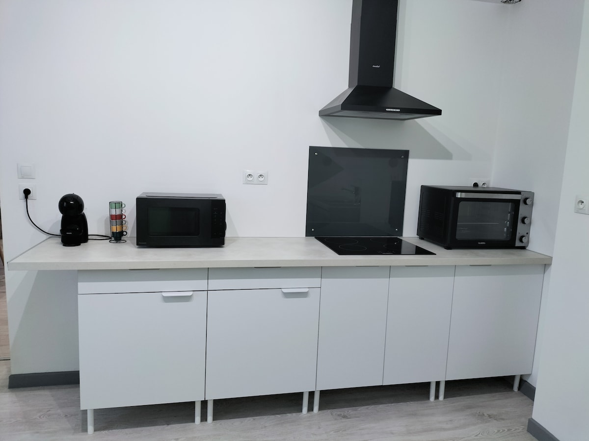 Residencia con aparcamiento (cerrado entre las 22:00 y las 6:00, acceso con código). Salón/cocina: sofá cama de 2 plazas, TV, wifi, horno eléctrico, placa de gas de la ciudad, hervidor, cafetera Senseo, microondas, vajilla para 4. Dormitorio 1: cama de 2 plazas 140x190 con colchón de calidad, armario. Cuarto de baño: ducha, lavabo, inodoro, lavadora. (El acceso al cuarto de baño se realiza a través del dormitorio 1). Habitación en altillo (bajo techo inclinado): cama individual. Acceso por una escalera empinada. Caja de llaves conectada.
