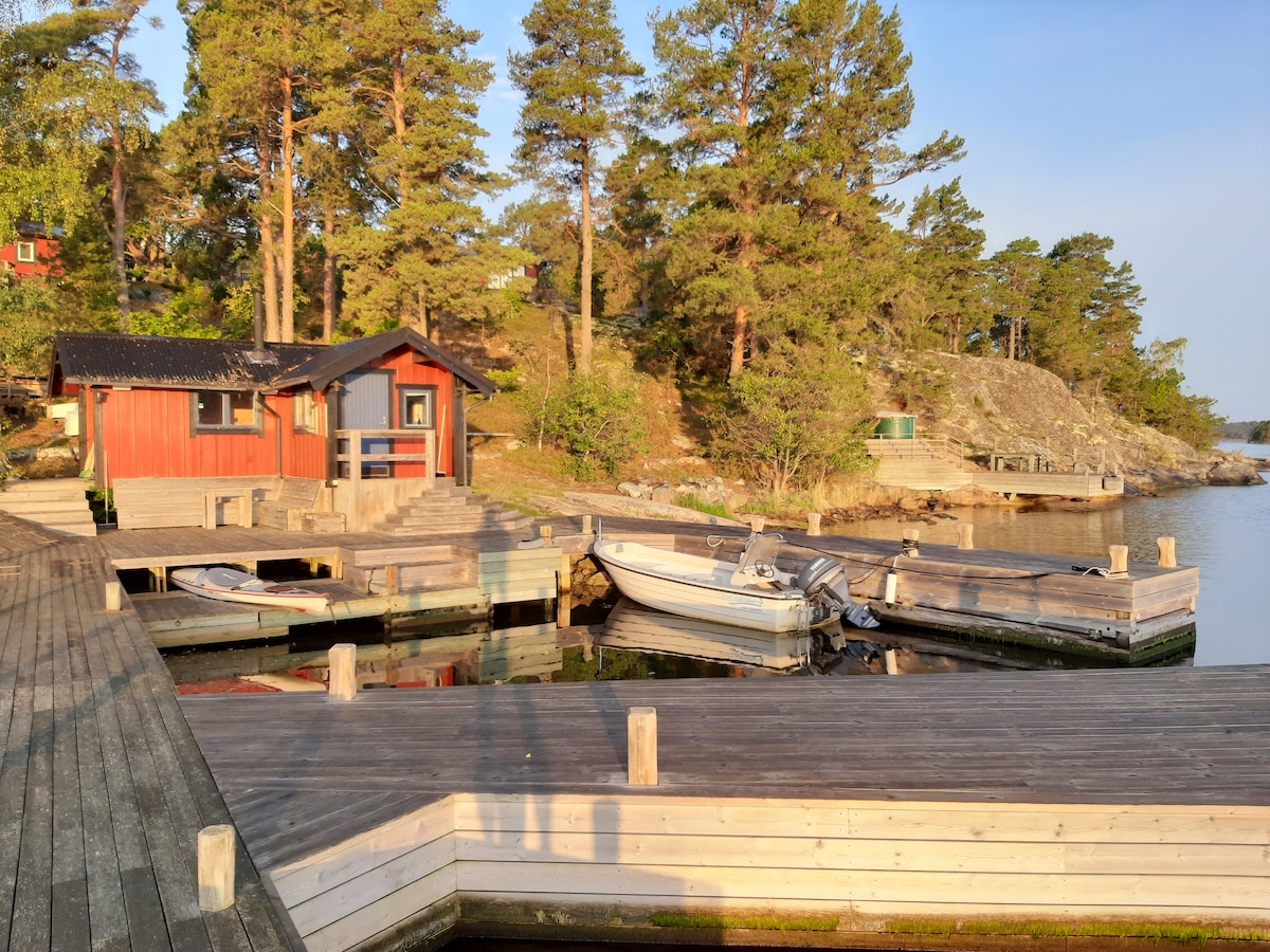 En una fantástica parcela junto al lago con sol todo el día y vistas al lago desde el alojamiento, esta casa de 55 metros cuadrados se encuentra en parte de nuestra gran parcela. Hay una sauna, un muelle de baño, una playa de arena y zonas con césped. En invierno perforamos un fregadero de hielo para nadar. Salón comedor con mesa, sofá y chimenea. Cocina bien equipada con lavavajillas, microondas, horno, nevera y congelador. Dormitorio con cama de 180 cm. Baño con ducha y retrete de compostaje. Lavadora y secadora. Ciudad de Estocolmo a 25 km