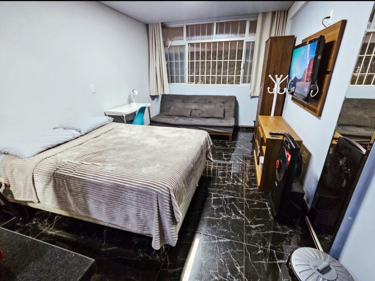 Kitnet na Asa Norte Tiene una excelente ubicación en un vecindario noble cerca de todo; panadería, farmacia, lavandería, supermercados, centros comerciales, salones de belleza y parque ecológico con dos manantiales. Unb y Ceub están a 3 km. Esplanada de los Ministerios a 5 km. Cama tamaño queen con colchón de muelles en bolsas individualmente estándar. Banda ancha ligera Cuenta con un televisor inteligente de minibar de 42pulgadas, microondas, filtro y ventilador. Estacionamiento público disponible y parada de autobús a menos de 100 metros.