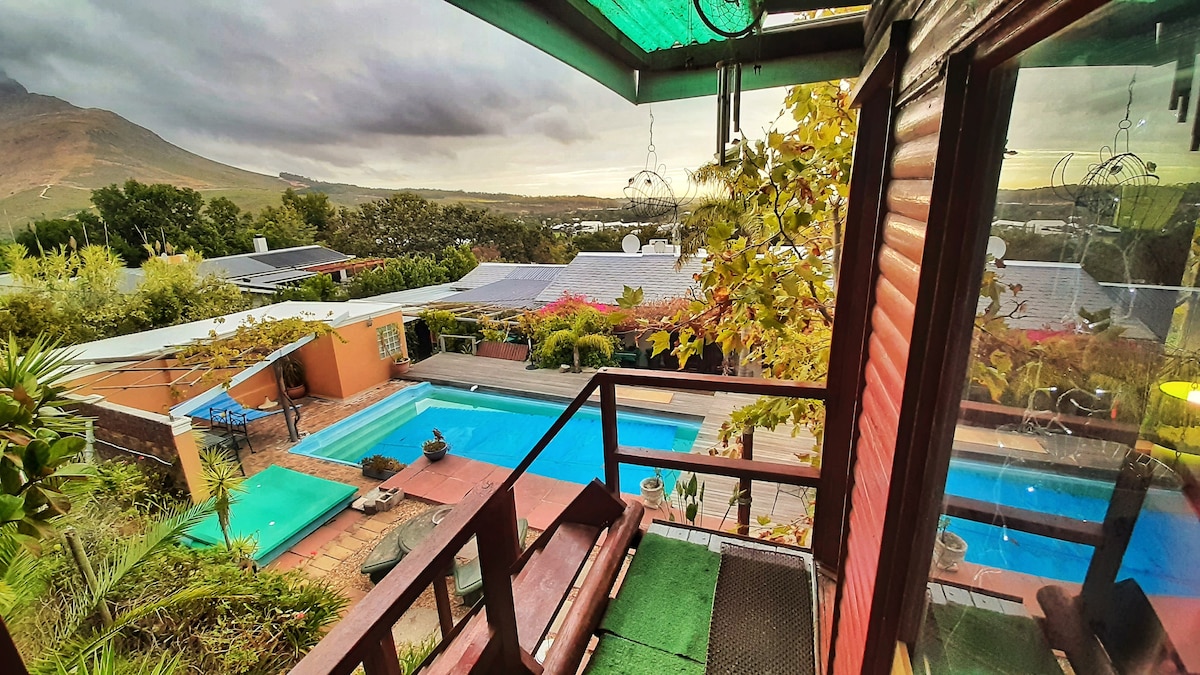 ¡No hay restricción de carga aquí! Relájate y desconecta en este alojamiento tranquilo y elegante. Situado en un barrio seguro y frondoso, muy cerca de senderos para hacer senderismo y ciclismo. A poca distancia a pie de la histórica ciudad de Stellenbosch. Todos los servicios que puedas desear. Siéntate afuera en la terraza de madera y disfruta de una copa de vino mientras contemplas las magníficas vistas y puestas de sol. O disfruta de los días cálidos y soleados junto a la piscina mientras preparas tus propias pizzas. Máquina de hielo Scotsman Cafetera Astoria Horno de leña para pizza