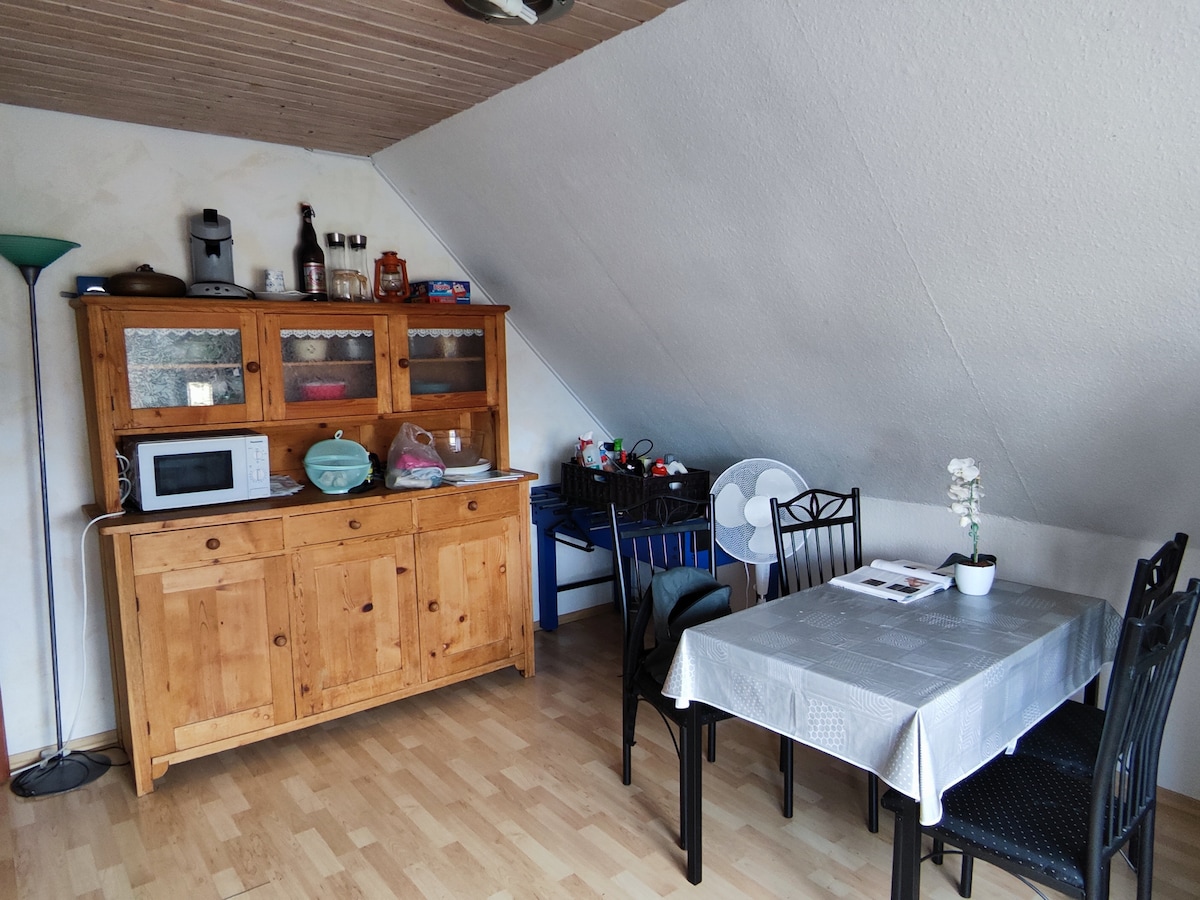 Acogedor y luminoso apartamento en el ático de una espaciosa casa para dos familias en una zona tranquila cerca del bosque en Weinsberg. El alojamiento es ideal como punto de partida para todo tipo de actividades en el valle de Weinsberg, ya sea para artistas, viajeros, montadores, excursionistas, amantes del vino y turistas, solos o en pareja. La cocina americana (fuera del dormitorio), el baño privado y el balcón ofrecen la independencia y el aislamiento necesarios.