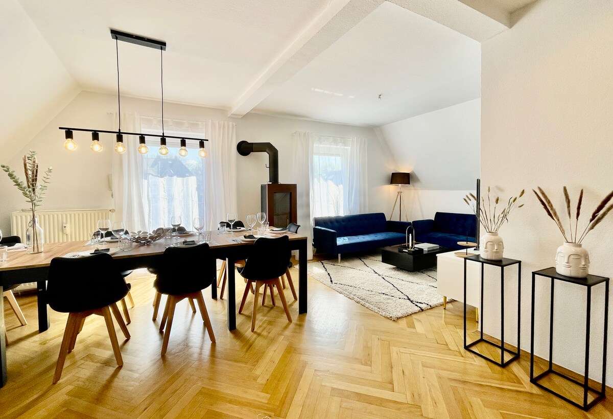 Bienvenido a Moor-home y a este elegante apartamento dúplex con chimenea para 10 personas y, por lo tanto, perfecto para viajes en grupo. A solo 10 minutos del centro de Bremen con todas sus vistas. El departamento está totalmente equipado con todo lo necesario para una estancia excelente en tu alojamiento temporal en Bremen. → cómodas camas de somier tV → inteligente con chimenea→ pivotante → NETFLIX → NESPRESSO → Cocina con nevera-congelador con función de cubitos de hielo