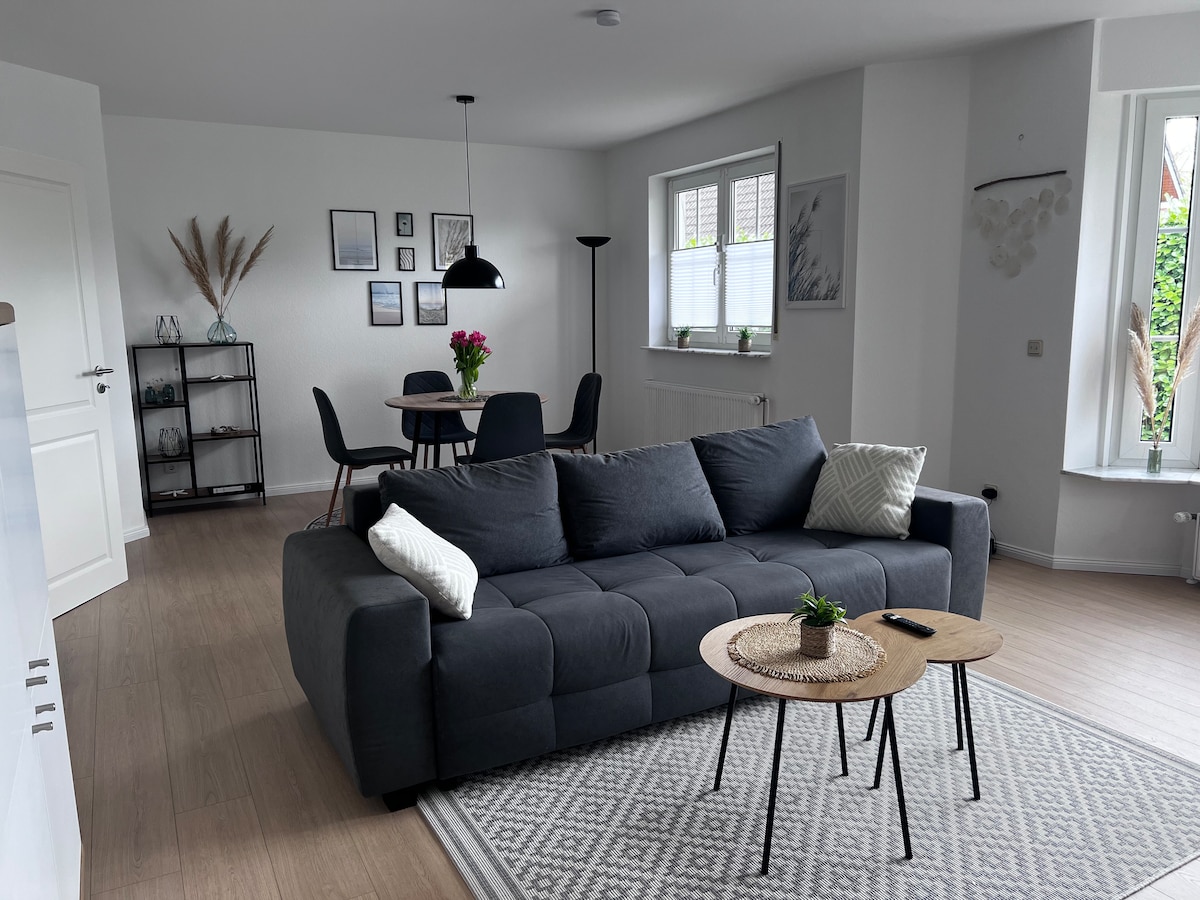 Welcome to our modern and stylish 2-room flat with 5 beds, own kitchen and good parking facilities . Enjoy your morning coffee on one of the two balconies, accessible from every room. The location is perfect: quiet yet central in Stuhr, with quick access to Bremen city centre and the airport. Shopping facilities, restaurants and IKEA are nearby. Explore the ramparts along the Weser. The neighbourhood is wonderfully quiet.