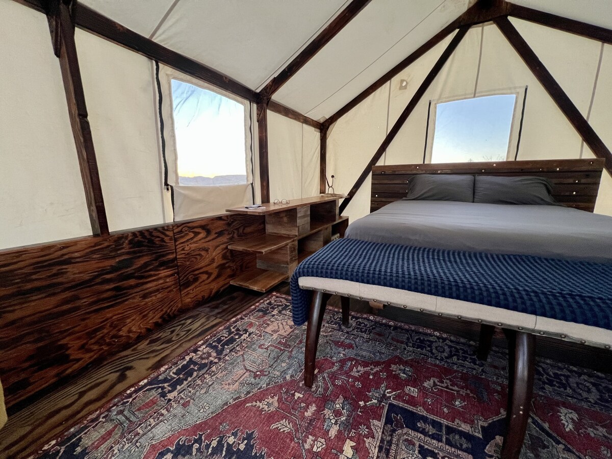 Terlingua Belle es una tienda de campaña amueblada de 13 pies con calefacción, aire acondicionado y un baño privado ubicado a pocos minutos de Ghosttown. La tienda está instalada en un «rincón» privado de la propiedad, ¡no hay otras tiendas o tipis en la propiedad! Los cómodos asientos al aire libre ofrecen una vista increíble del cielo nocturno, así como hermosos amaneceres. Los senderos iluminados conducen desde el aparcamiento hasta la tienda y desde la tienda hasta el baño. Belle se encuentra a aproximadamente 1 milla de la autopista en un camino de tierra.