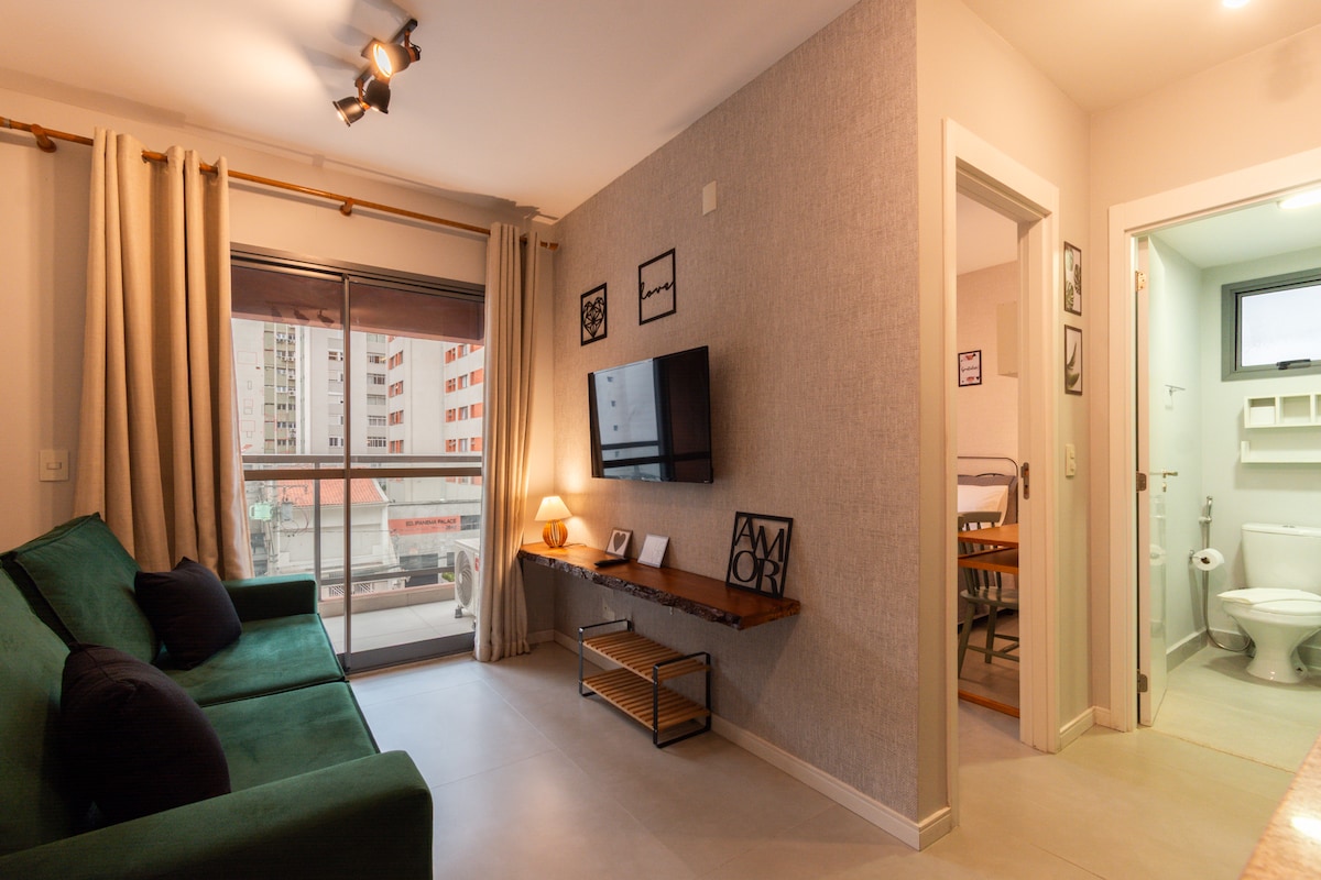 Estudio de 26m² con decoración de autor en el corazón de Jardins. ¡Ambiente cálido e ideal para personas que viajan solas, con amigos, parejas y familias con hijos! Alojamos hasta 4 huéspedes con comodidad y versatilidad Estamos ubicados a 3 minutos de la famosa R. Oscar Freire: segura, llena de restaurantes, tiendas, farmacias y mercados En una zona céntrica, ideal para quienes también quieran explorar puntos importantes de la ciudad, como el Parque Ibirapuera, la Avenida Faria Lima, entre otros