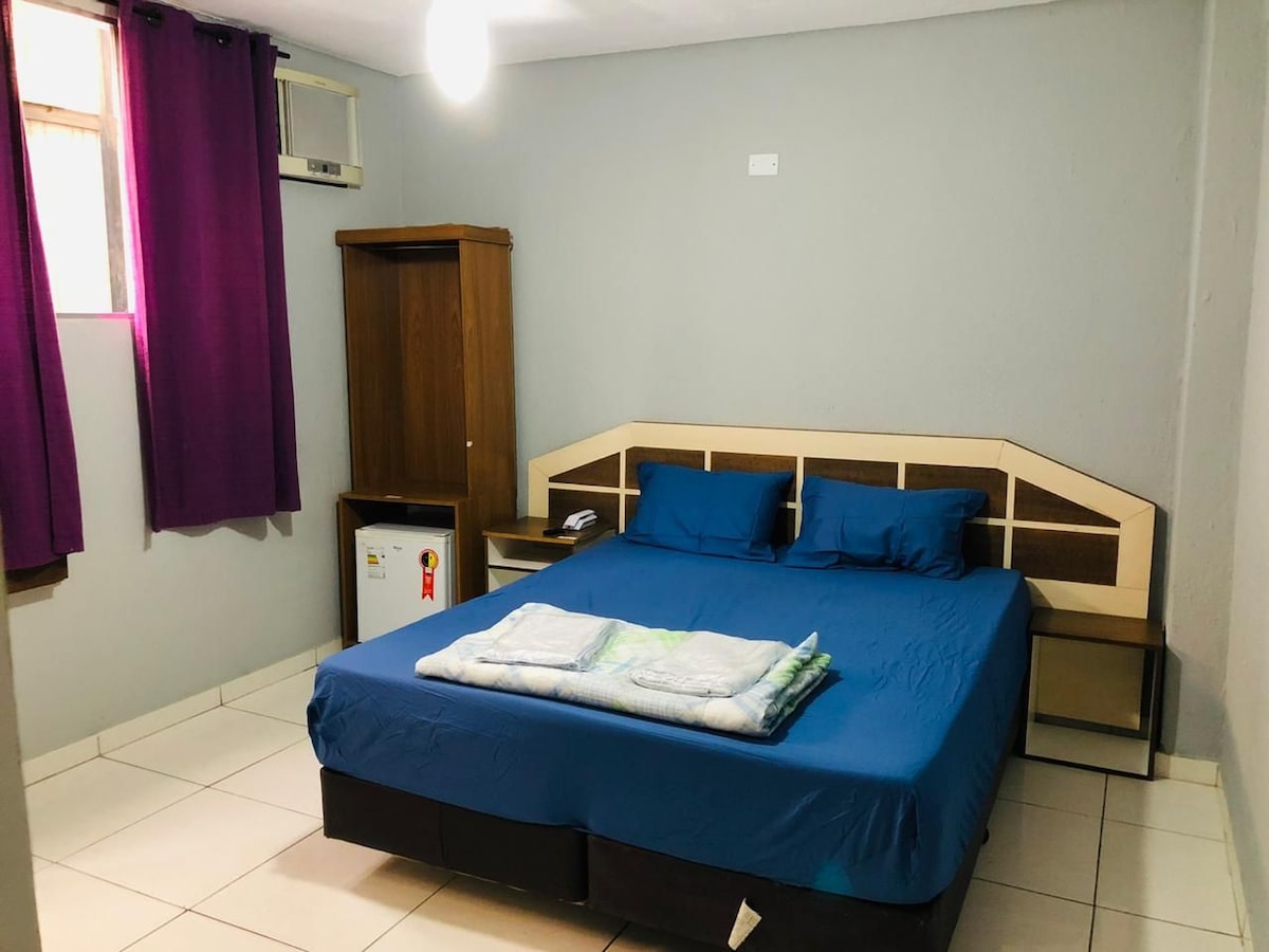 Quarto com banheiro privativo. Quarto individual com banheiro privativo. O quarto com banheiro privativo está equipado com microondas, frigobar, mesa de jantar, pratos, talheres e copos. Inclui TV Smart 43, ferro de passar roupa, secador de cabelo e enxoval de cama e banho.