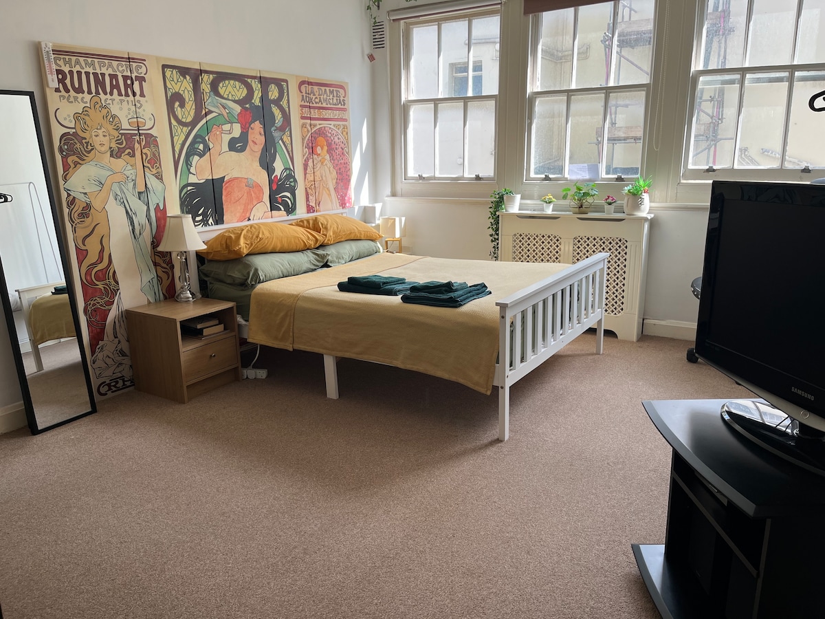 Disfruta de una estancia increíble en nuestro precioso apartamento con balcón, situado en el primer piso, en el centro, en un edificio de estilo Regency reformado en el moderno Kemptown de Brighton. La luz entra a través de 3 ventanales que dan al mar. El apartamento tiene un balcón accesible; está lleno de características originales: techos altos con yesería decorativa, chimenea y persianas de madera originales; así como GCH, planta abierta, bien equipado, cocina, TV inteligente, ducha a ras de suelo recién instalada (sin baño) y un acogedor dormitorio doble.
