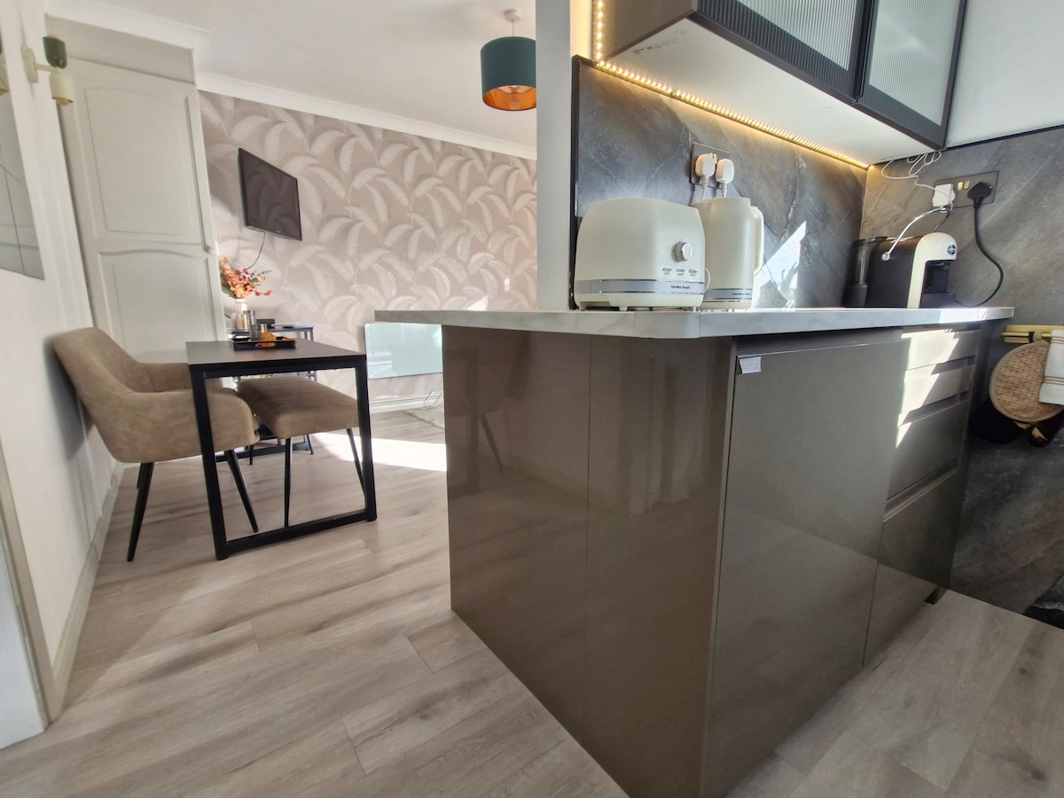 SELF-CONTAINED and BRAND NEW (Oct 2020) studio annex (attached to stunning home) with OWN SEPARATE ENTRANCE. Imagine the comfort and style of a 5* boutique hotel, with the cosiness and relaxed feel of home... FEAT: *ENHANCED CLEANING *Brand new luxury KING SIZE bed *Stunning luxury ensuite w/ walk-in dbl shower *Enormous freestanding bath *Underfloor heating *Wifi *55" TV *Complimentary Netflix *Desk *Hotel-style "kitchenette" w/ microwave; mini fridge; kettle, teas & Nespresso *Table & chairs