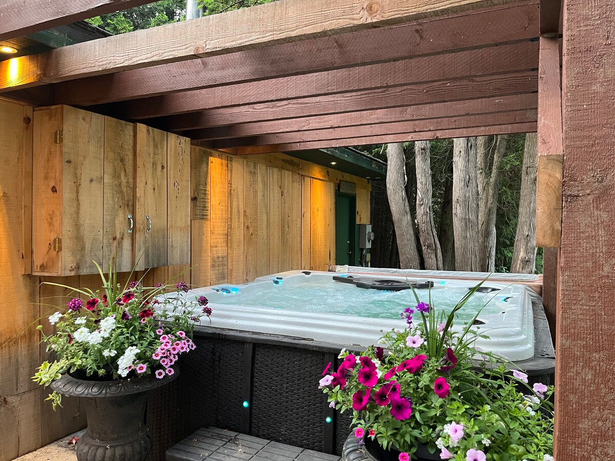 Take it easy at this unique and tranquil getaway. Located steps from Calerin Golf Course (350 m) and includes many amenities, such as: a BBQ, patio w/ dining area, private hot tub, acres of groomed trails, games galore, pool table, fire pit, comfy queen bed w/ separate heated bunkie with a second queen bed and more! Optional pull out available, please inquire within (fee may apply). 2 km or 5 mins, from the picturesque town of Erin. Lots of restaurants, shops, and plenty to do!