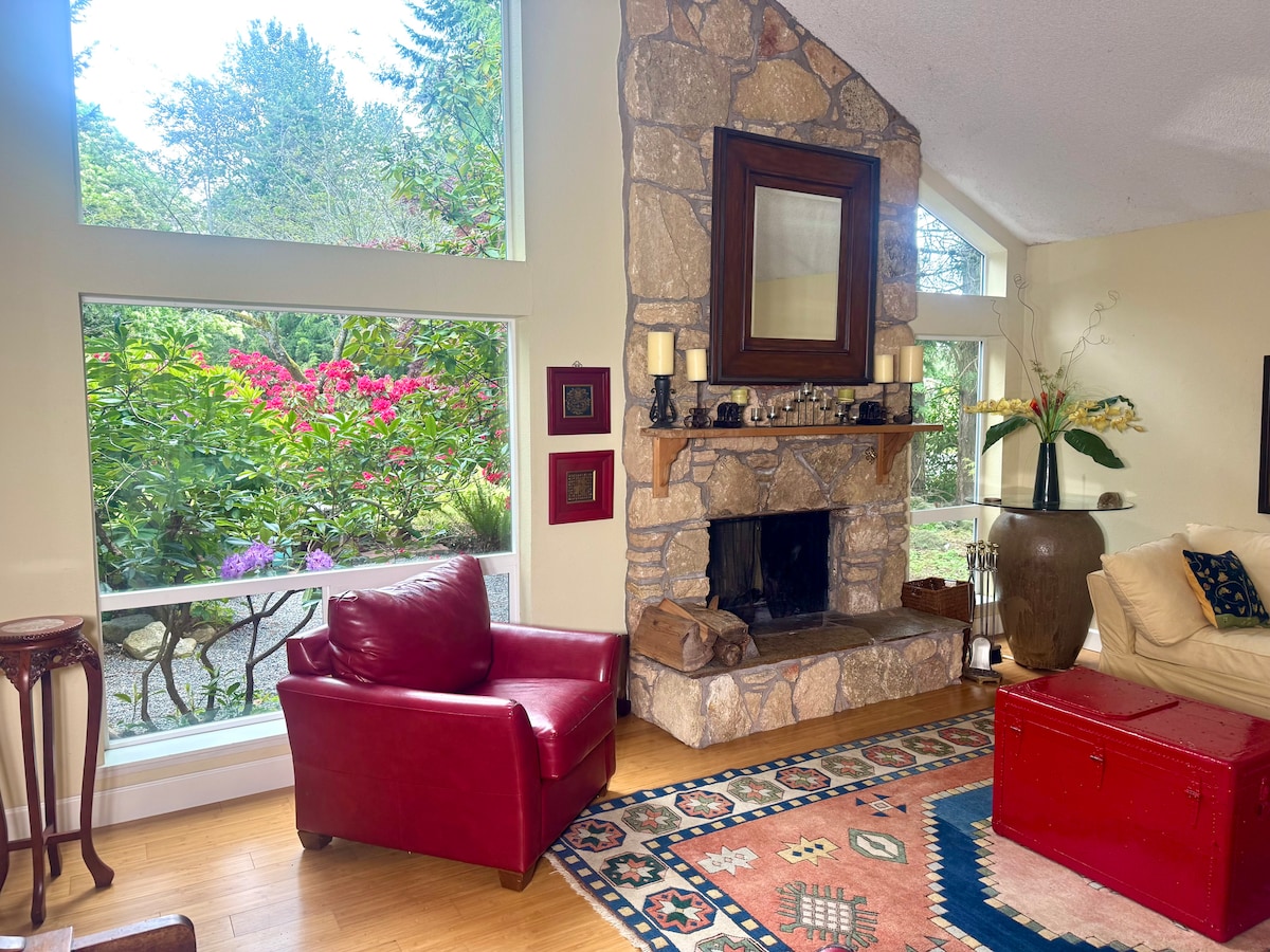 ¡Esta escapada al bosque encantado proporcionará el entorno relajante que tu alma anhela! Desde la hermosa cascada y el arroyo que rodean la propiedad, hasta las vistas al agua del estrecho de Puget, cinco acres para explorar y a solo un rápido y tranquilo paseo hasta el acceso a la playa con uso de kayaks y tablas de remo... ¡esta propiedad está lista para que vengas a relajarte y disfrutar! La ubicación es privilegiada para explorar en cualquier dirección desde el fácil acceso a los transbordadores de Seattle, las bases militares, el canal Hood y el bosque nacional Olímpico.