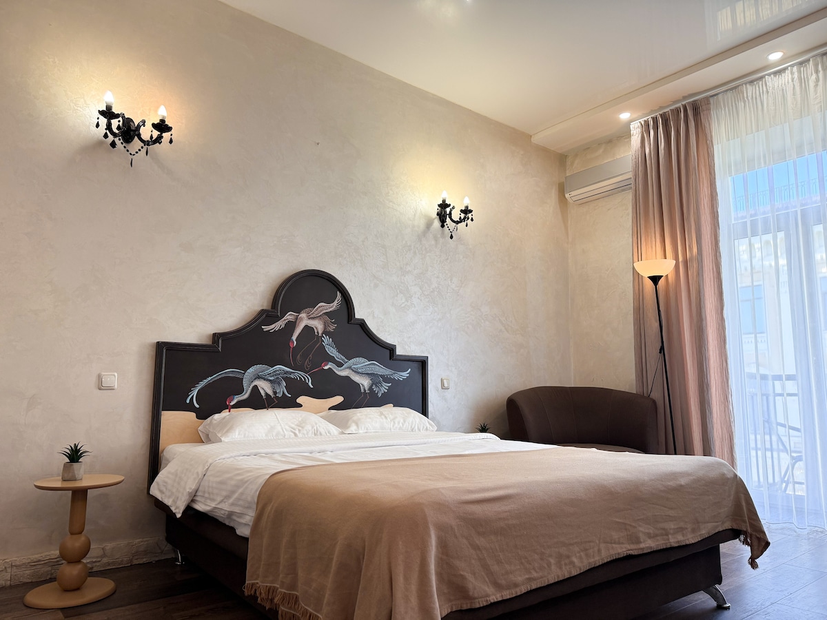 Апартаменти дуже просторі та світлі. З вікон видно дзвіницю Софійського собору. В кімнаті велике двоспальне ліжко, РК-телевізор, стіл, робоча стійка, тумби, журнальний столик, шафа зберігання одягу, крісла. На кухні є чайник, РК - телевізор, мініхолодильник, посудомийна машина, варильна поверхня, мікрохвильова піч, посуд для приготування їжі, тарілки, чашки. Є чай, кава, цукор, одноразові гель для душу та шампуні, рушники, постільна білизна, фен та праска. Душова кабіна, пральна машина.