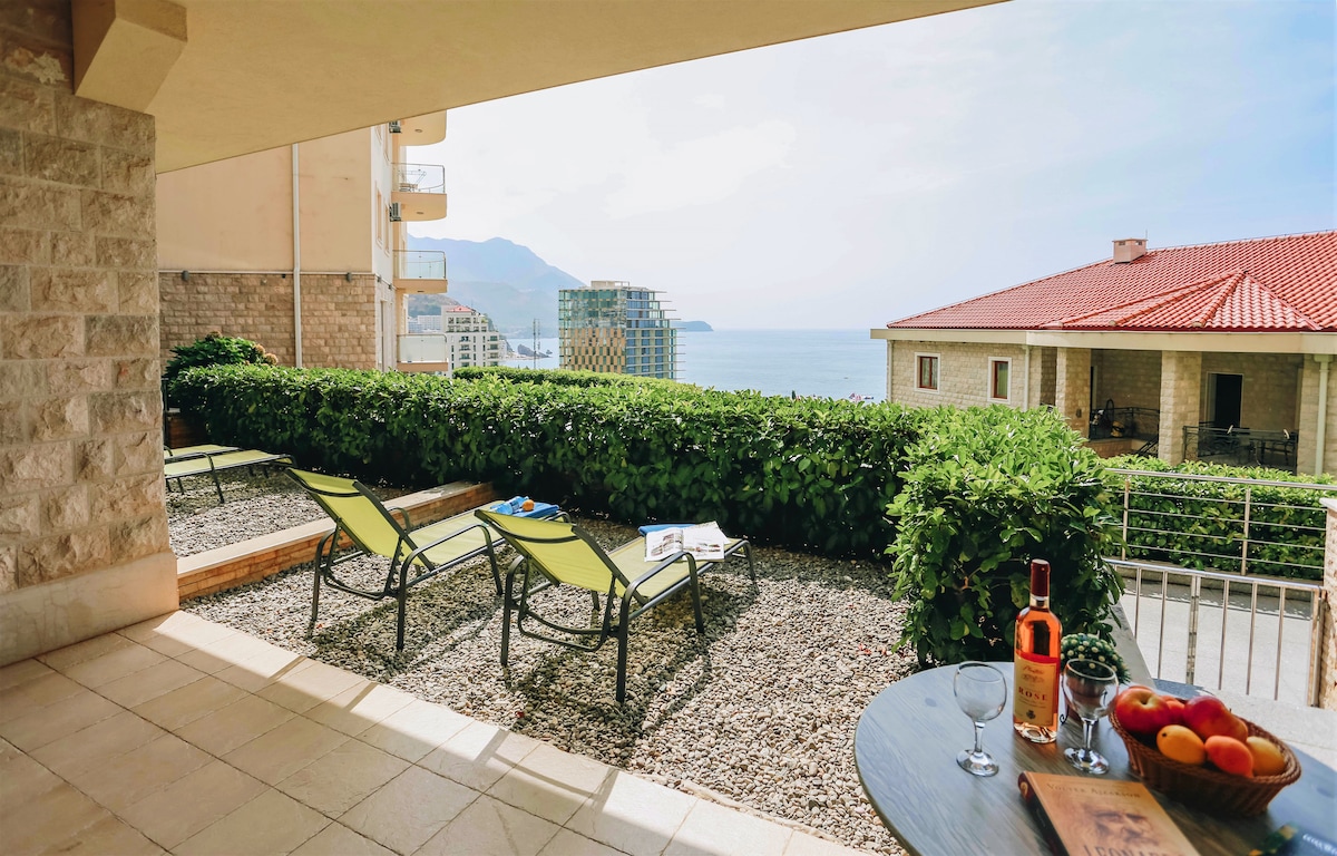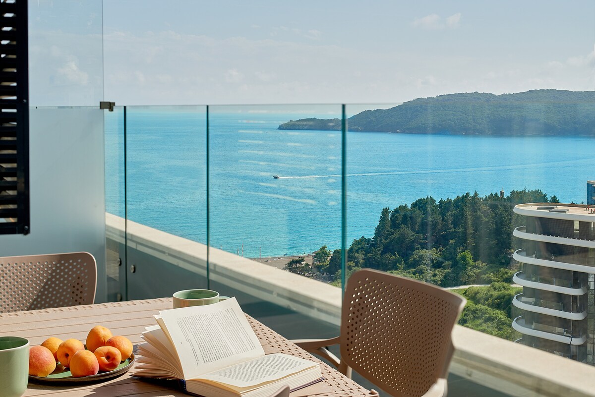 Experience refined comfort with the whole family—our space offers the perfect blend of luxury design and a true beachside atmosphere. Unwind with a stunning 180 degree view of the Adriatic Sea, 4-minute stroll to the famous Becici beach and right by a rich variety of cafes, restaurants and supermarkets. ✔ Spacious private balcony with 180* sea view ✔ Free private parking ✔ 72 sqm, 2 bedrooms ✔ 4 minute walk to the beach ✔ Infinity pool ✔ Beauty salon and restaurant on-site ✔ Elevator access