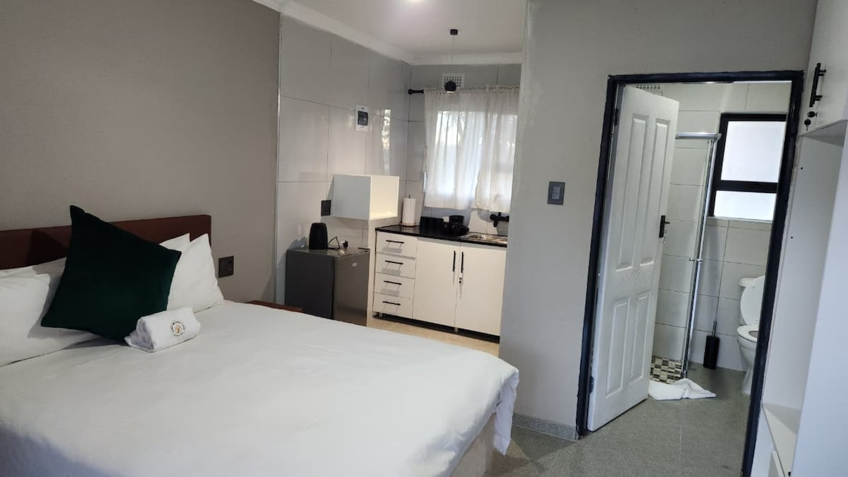 Come and experience this new luxurious and stylish space. It offers a cozy and comfortable queen size bed, a TV with Dstv, a fridge and a work table. There is a big well kept garden that you can use at your pleasure. A super clean home away from home. There is back-up for electricity outage and Borehole water. Unlike our other units, this one has no cooking facilities but there is a hotel nearby to have some meals.