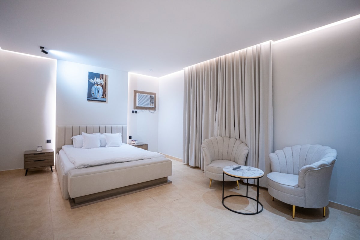 Disfruta de una estancia excepcional en este lujoso apartamento que combina el carácter contemporáneo y la identidad cultural de la región de Qassim. Diseñado cuidadosamente para darte una sensación de calidez y pertenencia, con detalles decorativos inspirados en colores y formas elegantes de la herencia, mezclados con elegantes toques de hotel. El apartamento tiene 3 dormitorios elegantes y cómodos, una cocina totalmente equipada con todas las herramientas y electrodomésticos necesarios para preparar tus comidas con comodidad, así como un salón de lujo con un espíritu lujoso, y tres baños modernos con acabados elegantes que ofrecen la máxima comodidad y privacidad.