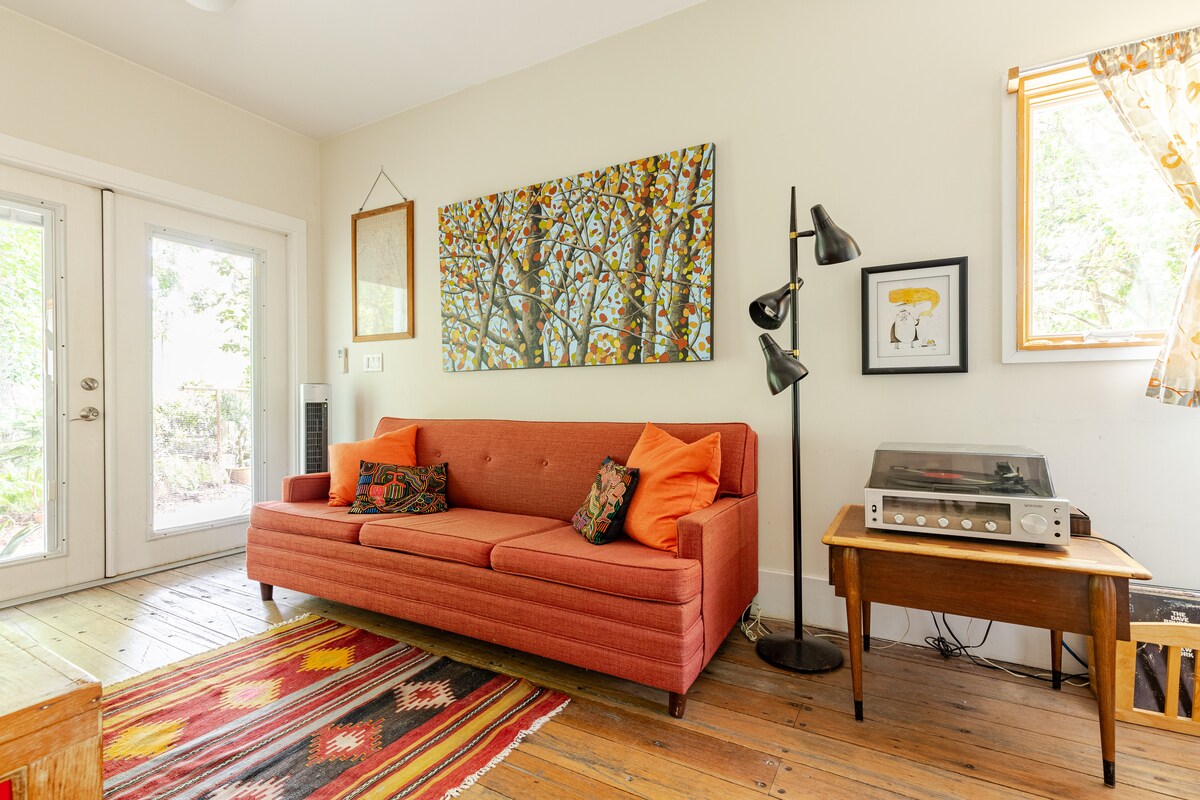 El estudio es una suite de invitados privada con comodidades de lujo. Este refugio de concepto abierto tiene una ubicación céntrica con un patio privado. En el interior, disfruta de una mezcla de diseño moderno y de mediados de siglo, con controles deslizantes de vidrio que crean una acogedora sensación de interior y exterior. Las comodidades incluyen un espejo de tocador LED, calentador de toallas de acero inoxidable, altavoz Bluetooth, mesa de comedor de vidrio, sofá cama convertible, silla cápsula suspendida y pantalla Google Home para mayor comodidad.