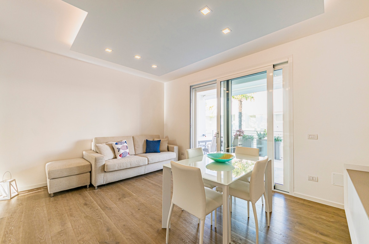 Monolocale frontemare in zona centralissima, ideale per coppie o single. Dispone di posto spiaggia con ombrellone e due lettini in ottima posizione e parcheggio privato di fronte all'appartamento compresi senza spese aggiuntive (per i turisti il park costerebbe 18euro/gg e l'ombrellone con i lettini quest'anno costerebbero una follia, sempre se si riesce a trovarli). Disponibili 2 bici pieghevoli in appartamento, Piano induzione, tv55 pollici, Wifi, frigo americano con acqua filtrata e ghiaccio