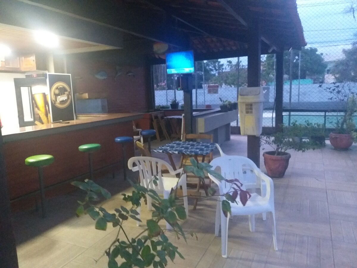 O Chalé é uma acomodação simples, porém com ótima localização. Próximo mercados, bares restaurantes, farmácias. A Praia do Forte esta apenas 8 minutos caminhando, bem como a feira de artesanato e o Parque das Águas. O Centro da cidade e a Rodoviária também ficam perto podendo fazer tudo a pé. Os chalés estão dentro de um terreno compartilhado com 4 chalés e uma casa principal. São suítes com varanda mobiliado com uma cama de casal, frigobar, ventilador e um roupeiro. O chuveiro é elétrico.