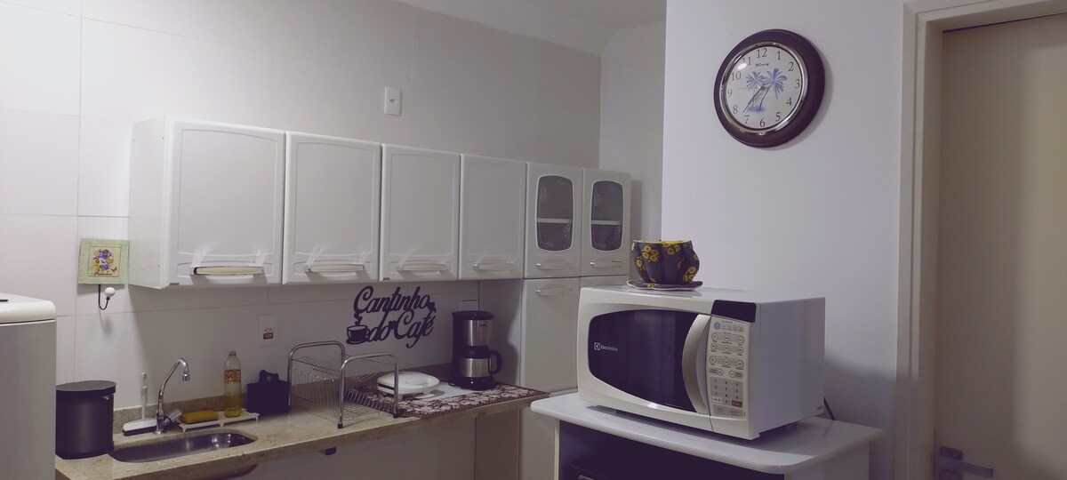 Flat bem localizado, próximo a restaurantes, padaria, comércios . A 200 m do Santuário Pai das Misericórdias , com vista para o Santuário, Espaço novo equipado com 3 bicamas , utensílios básicos de cozinha ( pratos, talheres, copos, travessas ) , cooktop 2 bocas, geladeira, liquidificador, sanduicheira,microondas , pipoqueira, airfryer, cafeteria , Purificador de água, secador de cabelo, ventilador de teto .Acomoda até 6 pessoas. Garagem privativa coberta, Internet wi-fi disponível no flat