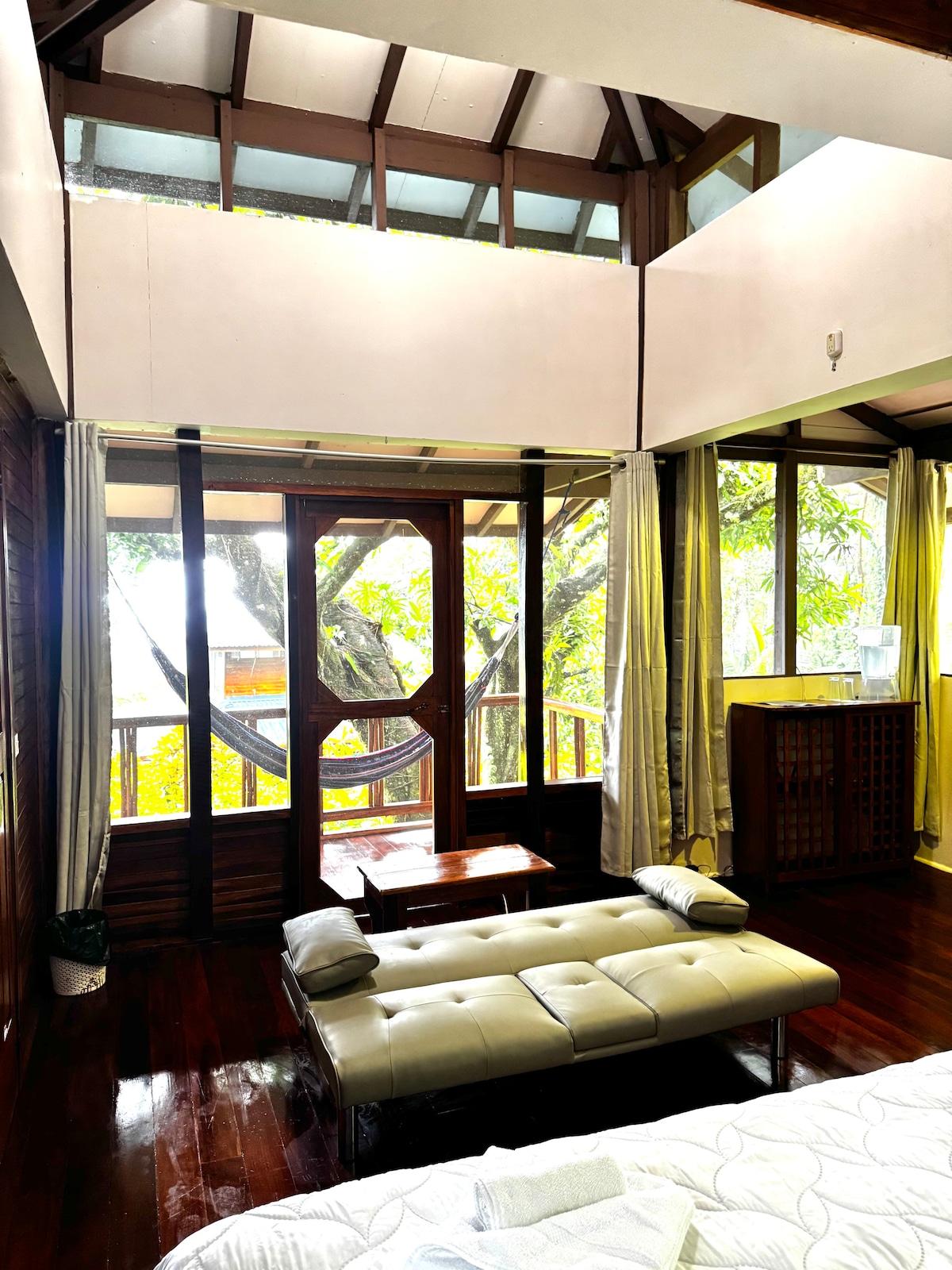 Dear travelers, this is not exactly a treehouse, but we decided to call it that because many of our guests describe the experience as feeling like being up in a tree. The cabin is located in the rainforest and only 5 minutes walk to Cocles beach and pristine Bluff Beach (just in front of Pirripli Island.) We currently have a 100 MB stable connection so it is a great option for people who need to work during their holidays. The access road is flat, easy walking for everyone and no 4x4 is needed