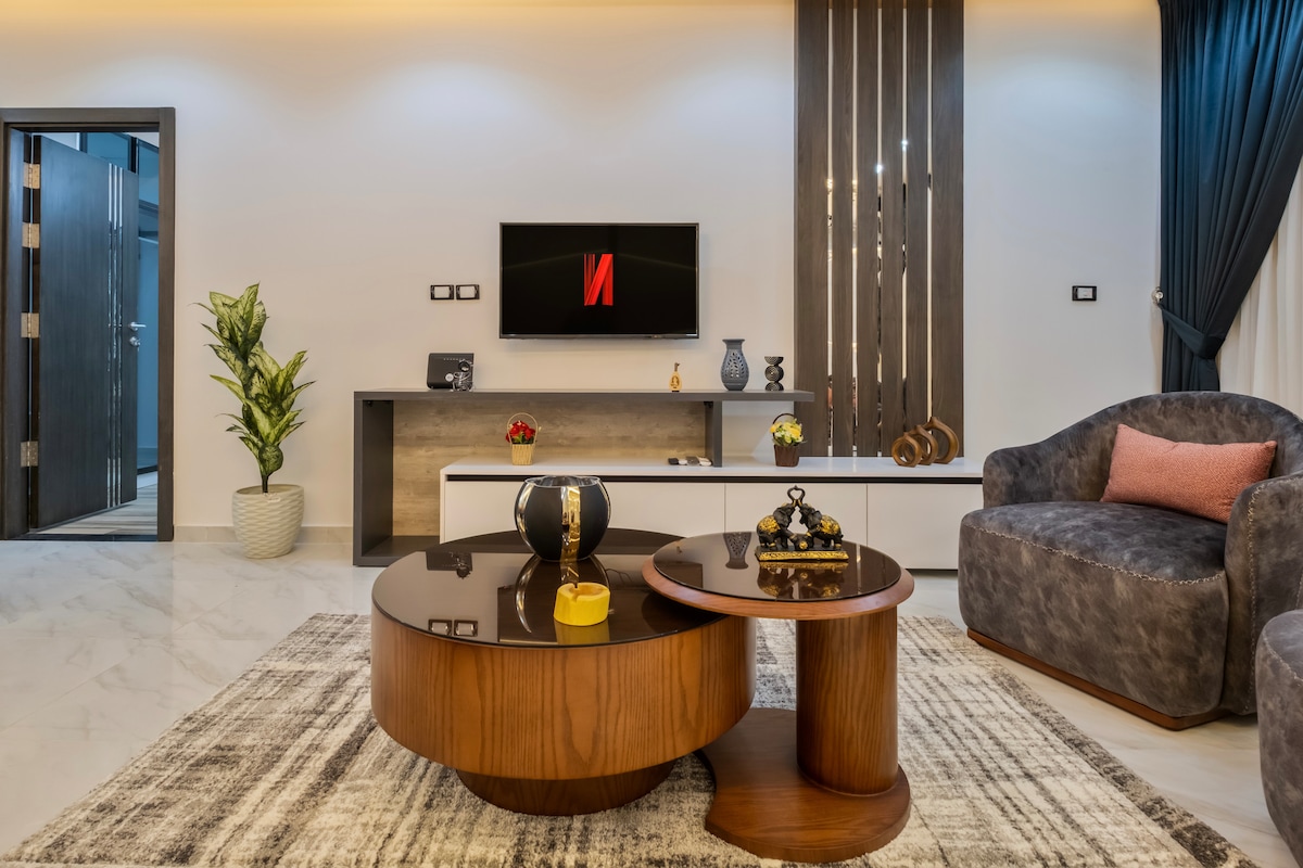 Nuestro moderno ático con piscina privada es perfecto para familias que buscan comodidad y lujo. Ubicado en una comunidad cerrada en la exclusiva zona de Nuevo Cairo, a solo 30 minutos del aeropuerto y cerca de servicios como KFC, Starbucks y una variedad de restaurantes occidentales y locales (Chili's, Fuddruckers, LongHorn Texas, Ibn Al Sham). Servicios como una cama tamaño king, lavadora, secadora, lavavajillas y microondas garantizan la comodidad, y 4 televisores inteligentes proporcionan entretenimiento.