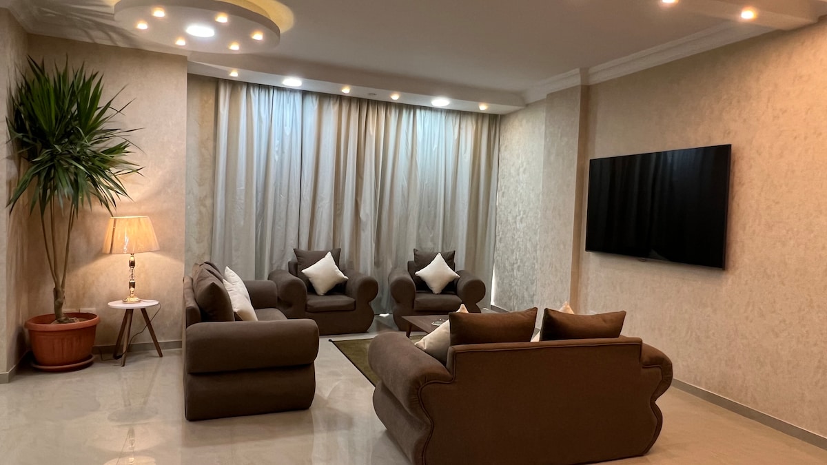 Este espacioso apartamento está totalmente amueblado y equipado con todo lo necesario para una estancia cómoda. Relájate y ve tus películas y programas de televisión favoritos en el sistema de sonido con acceso a Netflix, beIN Sports, Shahid, Watch it y Starzplay. Ubicado en una ubicación céntrica, cerca de todas las principales atracciones. A poca distancia a pie de la estación de autobuses, las tiendas y los restaurantes. Tanto si viajas por negocios como por placer, este moderno y elegante apartamento es el alojamiento perfecto.