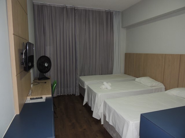Acomodação com uma cama de casal e uma de solteiro, ar condicionado, frigobar vazio, tv, internet, banheiro privativo, mesa e cadeira. Inclui café da manhã.